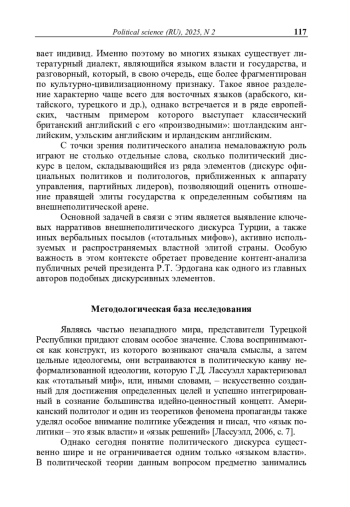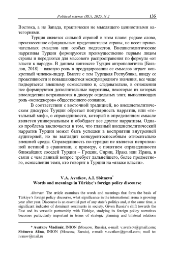 В статье рассмотрены слова и смыслы, составляющие основу внешнеполитического дискурса современной Турецкой Республики, значение которой на международной арене повышается из года в год. Дискурс является неотъемлемой частью политики любого государства и вместе с тем важным маркером настроений, преобладающих в обществе. Принимая во внимание разворот России на Восток и многоплановое партнерство с Турцией, задача по изучению ее внешнеполитических нарративов обретает особую актуальность с точки зрения стратегического планирования и перспектив двусторонних отношений. Авторы рассматривают «открытые» и «закрытые» нарративы официальной Анкары, а также выделяют главные вербальные посылы или «тотальные мифы», которые встраиваются властной элитой во внешнеполитический курс государства. Предпринята попытка с помощью контент-анализа публичных выступлений президента Турции Р. Т. Эрдогана за 2024 г. проанализировать частоту и контекст употребления ключевых слов, таких как: «лидер», «справедливость», «хаб» и «Мир больше пяти». Определено, что ключевым в 2024 г. стал нарратив о «справедливости», которому была посвящена бо́льшая часть речей турецкого лидера. Наряду с этим изучено соотношение декларируемого с реальным. Выявлено, что почти каждое слово наделяется как минимум несколькими смыслами, а нарратив о справедливости и вовсе является собирательным. Однако трактовка ряда слов и концептов президентом Турции может существенным образом отличаться от общепринятых норм или трактовок другими обществами. В связи с этим не все из них представляются конкурентоспособными относительно дискурсивных элементов внешней среды.