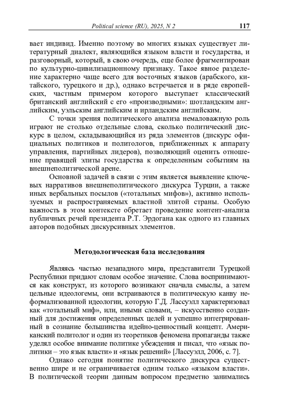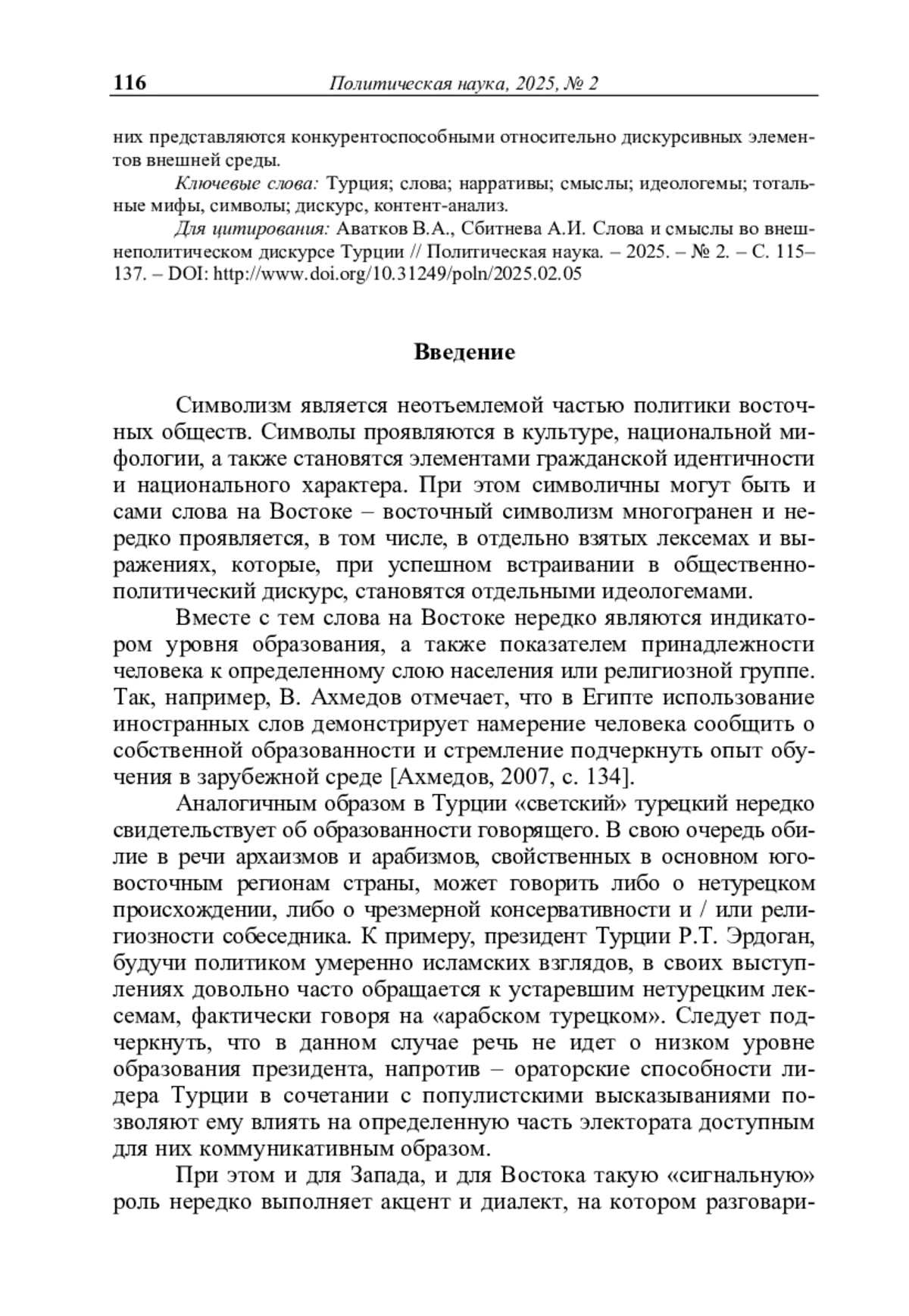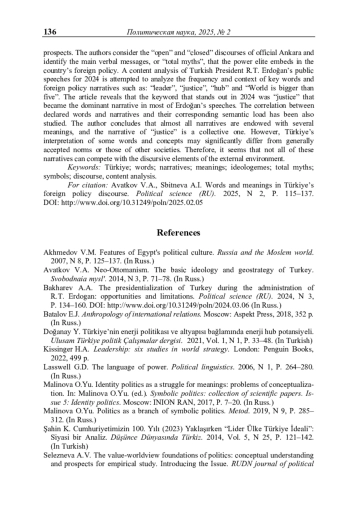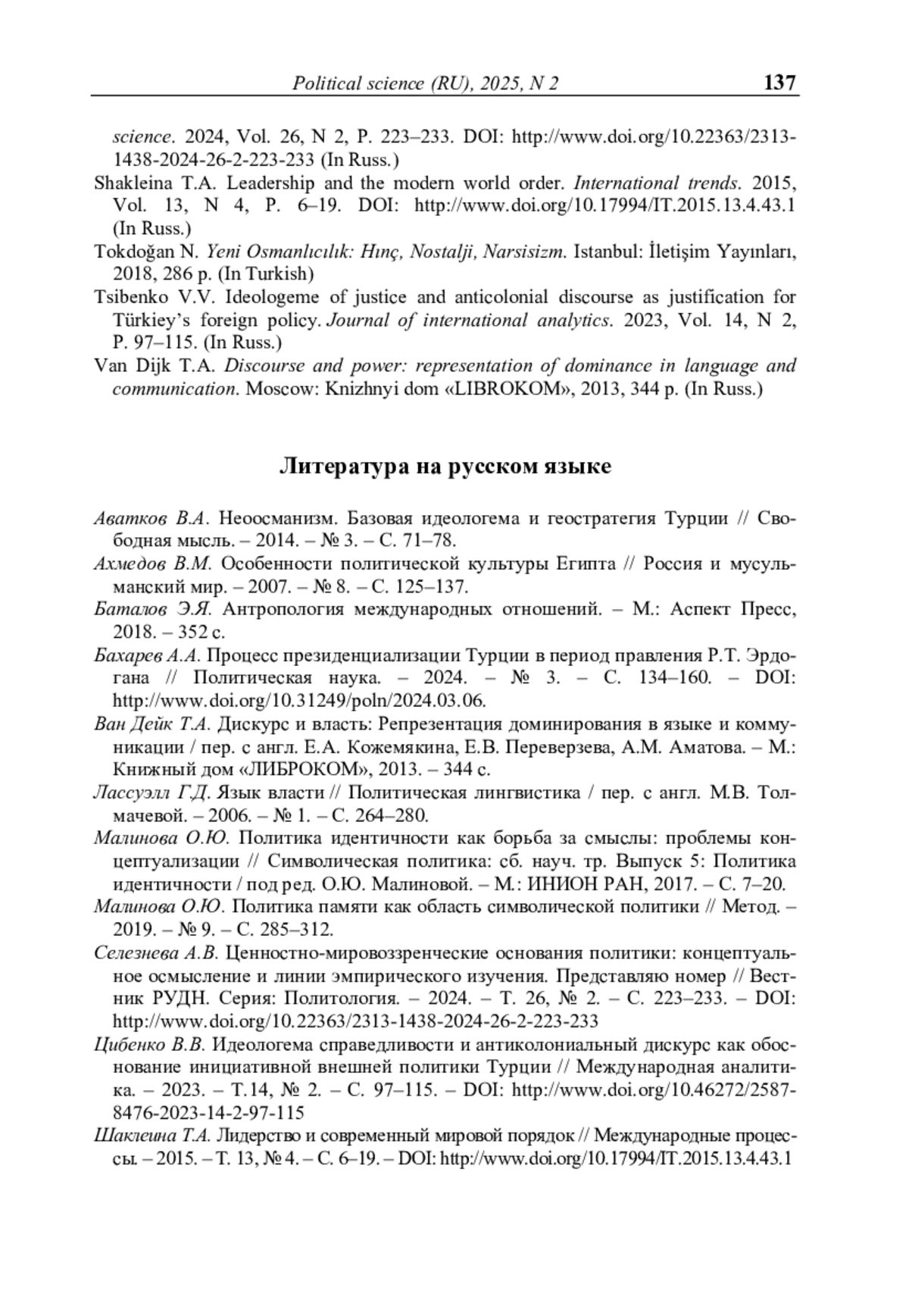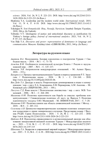 4. Бахарев А.А. Процесс президенциализации Турции в период правления Р.Т. Эрдогана // Политическая наука. - 2024. - № 3. - С. 134-160. - https://doi.org/http://www.doi.org/10.31249/poln/2024.03.06.