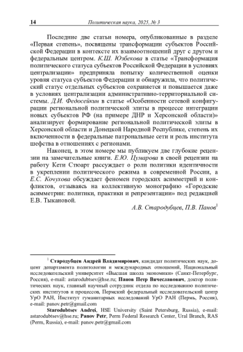 В рубрике «Ракурсы» мы собрали статьи, освещающие специфические аспекты многоуровневого управления через призму конкретных проблем, подходов и кейсов. Центральный среди них, конечно же, – политические процессы, связанные с политикотерриториальной гетерогенностью, которым посвящены четыре статьи номера.