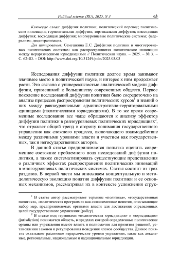 Данная статья представляет собой систематический аналитический обзор исследований, посвященных анализу моделей распространения политических инноваций в многоуровневых политических системах и основных механизмов распространения политики между иерархическими юрисдикциями. Особое внимание уделяется изменению эффектов распространения политических инноваций в контексте трансформации современного поля политической науки и переключению внимания исследователей к системам многоуровневого управления с участием нетрадиционных акторов (multilevel governance). В работе представлен обзор двух основных подходов к теоретической концептуализации процесса распространения политических инноваций – диффузии политики (policy diffusion) и политического трансфера (policy transfer). В первой части исследования рассматривается эволюция указанных теоретических моделей и соответствующих им основных механизмов диффузии. Во второй части исследования определяются ключевые детерминанты диффузии политики – структурные, институциональные и агентские характеристики, дается описание основных каузальных механизмов данных детерминант. Особое внимание уделяется феномену вертикальной диффузии (vertical diffusion) политических инноваций. Заключительная часть статьи посвящена сравнению моделей диффузии политики в западном и незападном политических контекстах на примере сравнительного анализа распространения политических инноваций в многоуровневых политических системах Китая и США.