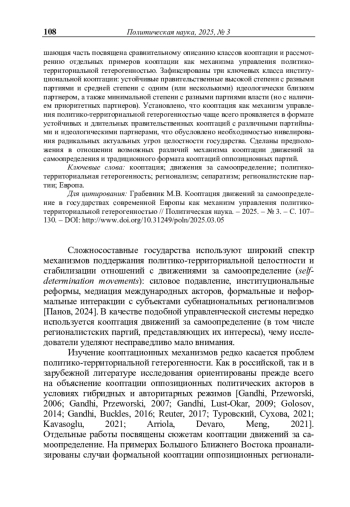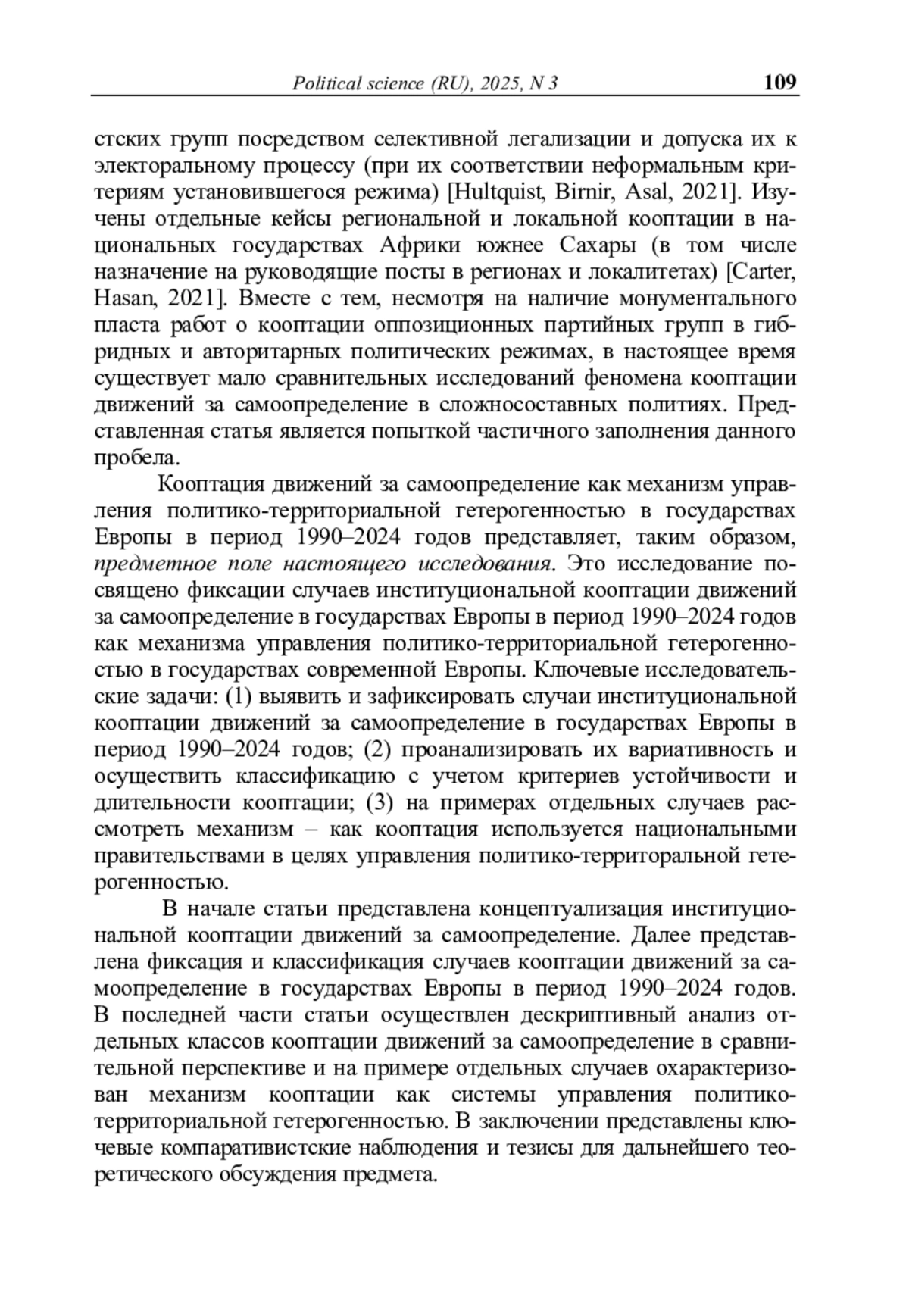 Кооптация движения за самоопределение может выступать в качестве механизма управления политико-территориальной гетерогенностью в современных многосоставных политиях. Исследовательское внимание в настоящей статье направлено на феномен кооптации движений за самоопределение общенациональным властями в государствах современной Европы в период 1990–2024 годов. В качестве ключевой аналитической задачи выступает фиксация случаев институциональной кооптации движений за самоопределение в государствах Европы в период 1990–2024 годов, их классификация с учетом критериев устойчивости и длительности процесса, а также характеристика (на примере отдельных случаев) кооптации как механизма управления политико-территориальной гетерогенностью. В первой части статьи описана авторская концептуализация кооптации движений за самоопределение, сравнительные параметры и границы классификации. Во второй части представлены случаи институциональной кооптации движений за самоопределение в государствах Европы в период 1990–2024 годов и их классификация с учетом критериев устойчивости и длительности описываемого явления. Завершающая часть посвящена сравнительному описанию классов кооптации и рассмотрению отдельных примеров кооптации как механизма управления политико-территориальной гетерогенностью. Зафиксированы три ключевых класса институциональной кооптации: устойчивые правительственные высокой степени с разными партиями и средней степени с одним (или несколькими) идеологически близким партнером, а также минимальной степени с разными партиями власти (но с наличием приоритетных партнеров). Установлено, что кооптация как механизм управления политико-территориальной гетерогенностью чаще всего проявляется в формате устойчивых и длительных правительственных кооптаций с различными партийными и идеологическими партнерами, что обусловлено необходимостью нивелирования радикальных актуальных угроз целостности государства. Сделаны предположения в отношении возможных различий механизма кооптации движений за самоопределения и традиционного формата кооптаций оппозиционных партий.