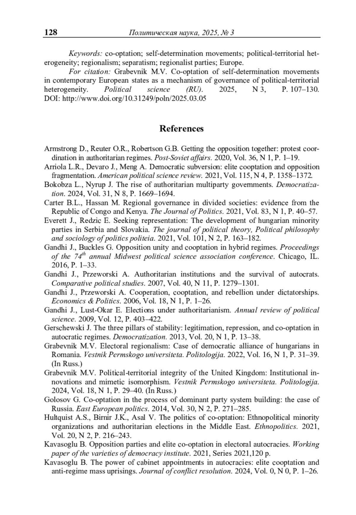 1. Грабевник М.В. Политико-территориальная целостность Соединенного Королевства: институциональные инновации и подражательный изоморфизм // Вестник Пермского университета. Политология. - 2024. - Т. 18, № 1. - С. 29-40.