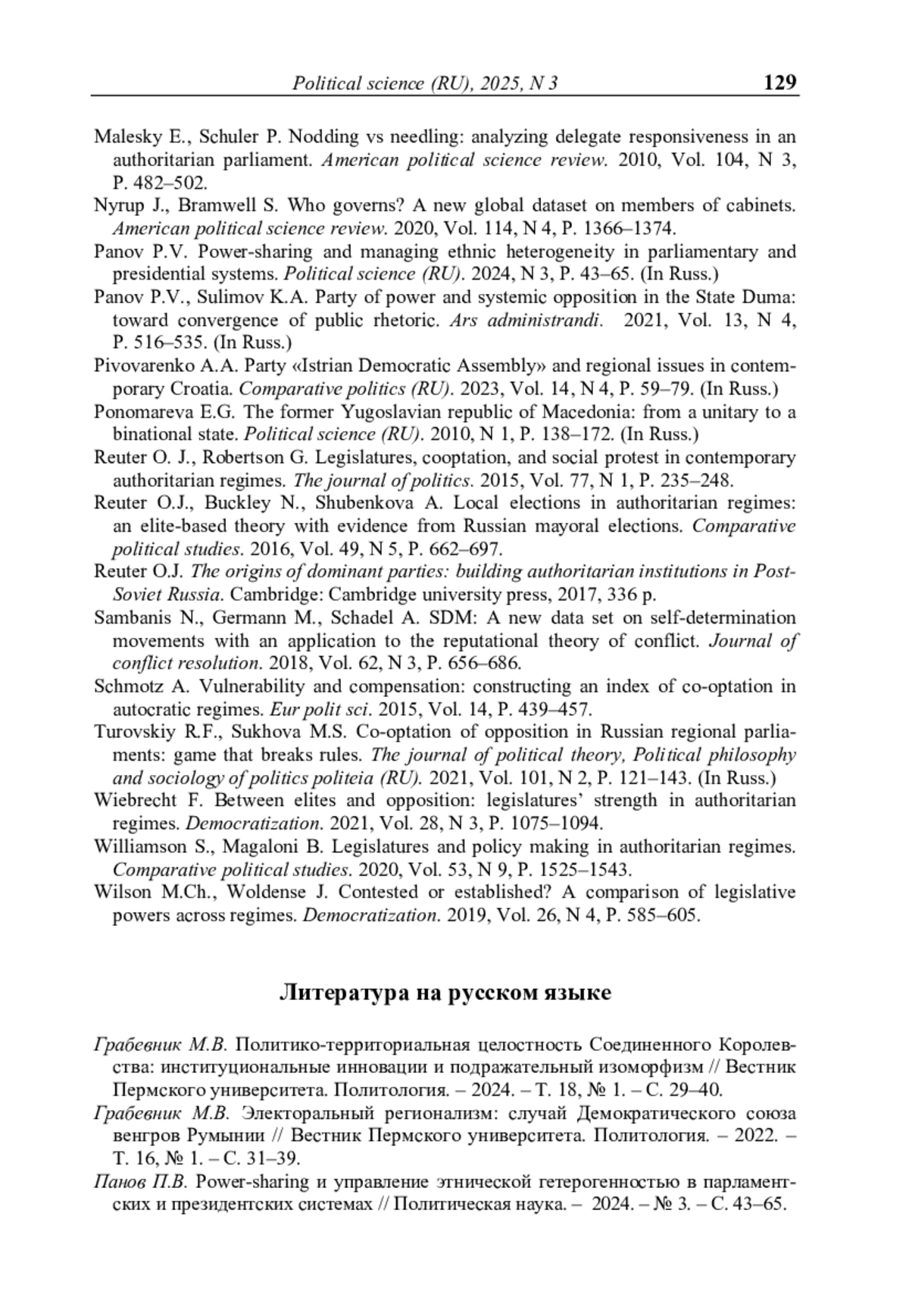 3. Панов П.В. Power-sharing и управление этнической гетерогенностью в парламентских и президентских системах // Политическая наука. - 2024. - № 3. - С. 43-65.