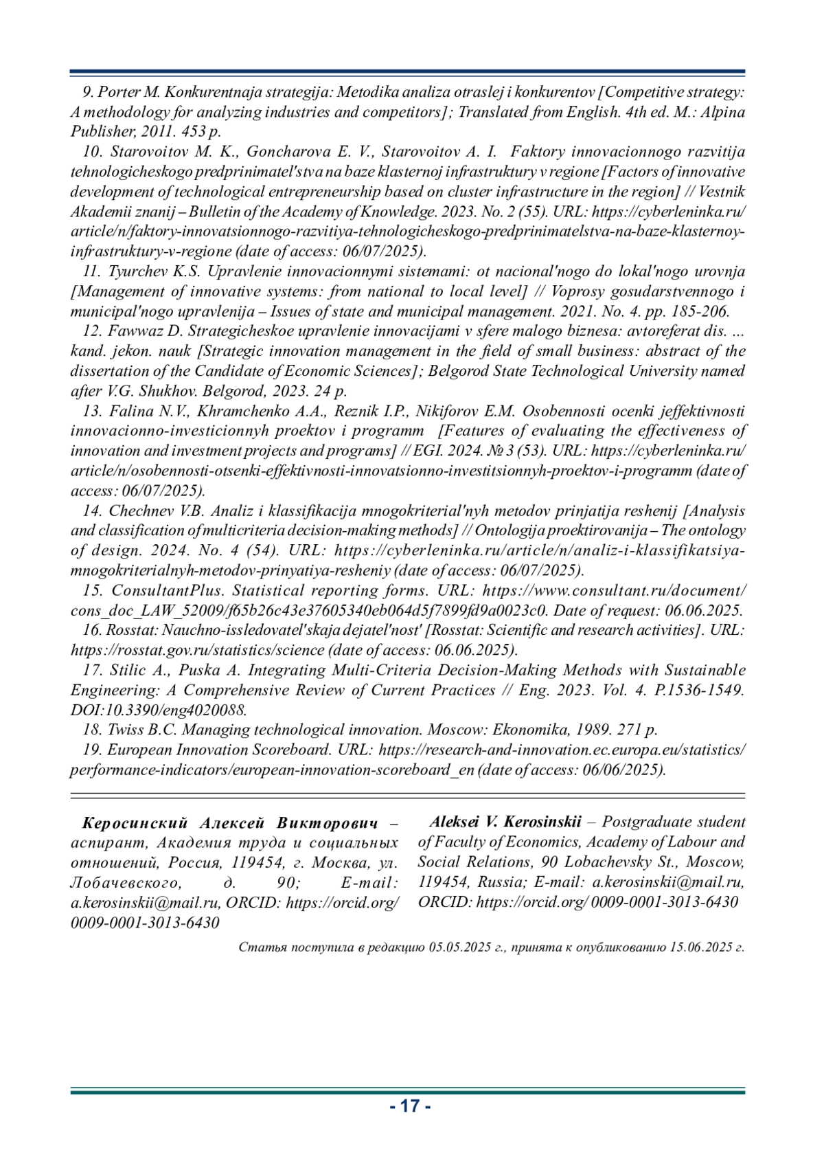КЕРОСИНСКИЙ А. В. ИСПОЛЬЗОВАНИЕ МУЛЬТИКРИТЕРИАЛЬНОГО АНАЛИЗА ДЛЯ ОЦЕНКИ ИННОВАЦИОННОЙ ДЕЯТЕЛЬНОСТИ МАЛЫХ ПРЕДПРИЯТИЙ // ИННОВАЦИОННАЯ ДЕЯТЕЛЬНОСТЬ. 2025. № 2 (73)