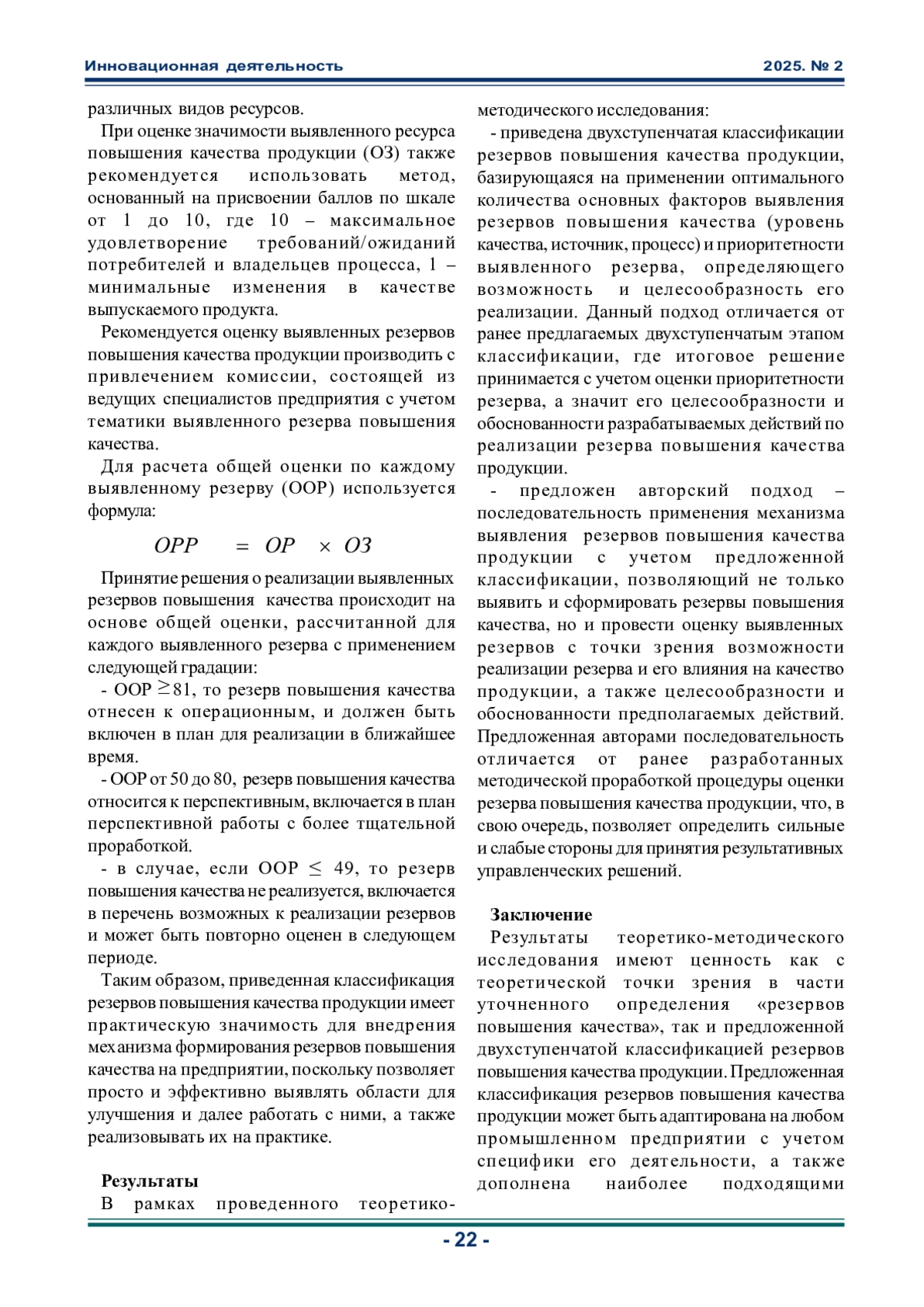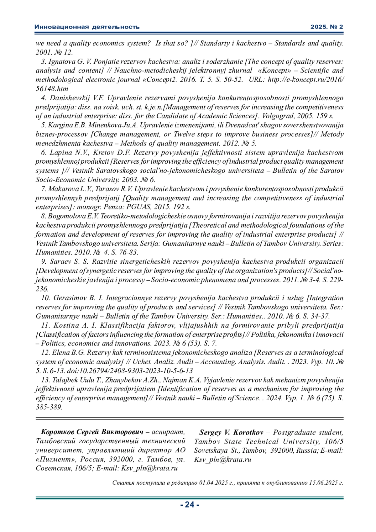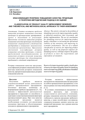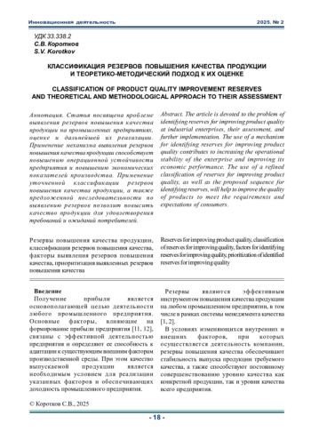 КОРОТКОВ С. В. КЛАССИФИКАЦИЯ РЕЗЕРВОВ ПОВЫШЕНИЯ КАЧЕСТВА ПРОДУКЦИИ И ТЕОРЕТИКО-МЕТОДИЧЕСКИЙ ПОДХОД К ИХ ОЦЕНКЕ // ИННОВАЦИОННАЯ ДЕЯТЕЛЬНОСТЬ. 2025. № 2 (73)