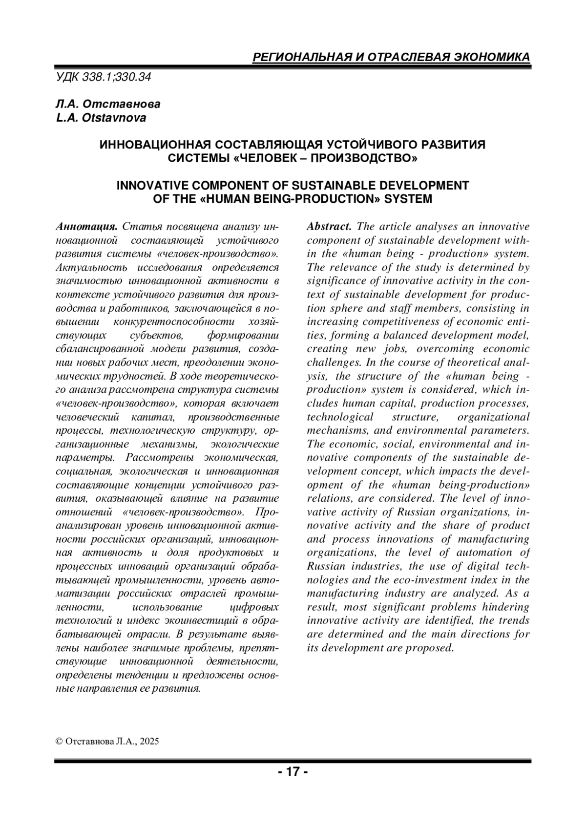 Статья посвящена анализу инновационной составляющей устойчивого развития системы «человек-производство». Актуальность исследования определяется значимостью инновационной активности в контексте устойчивого развития для производства и работников, заключающейся в повышении конкурентоспособности хозяйствующих субъектов, формировании сбалансированной модели развития, создании новых рабочих мест, преодолении экономических трудностей. В ходе теоретического анализа рассмотрена структура системы «человек-производство», которая включает человеческий капитал, производственные процессы, технологическую структуру, организационные механизмы, экологические параметры. Рассмотрены экономическая, социальная, экологическая и инновационная составляющие концепции устойчивого развития, оказывающей влияние на развитие отношений «человек-производство». Проанализирован уровень инновационной активности российских организаций, инновационная активность и доля продуктовых и процессных инноваций организаций обрабатывающей промышленности, уровень автоматизации российских отраслей промышленности, использование цифровых технологий и индекс экоинвестиций в обрабатывающей отрасли.