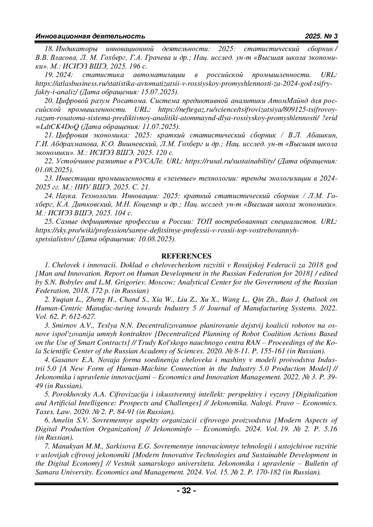 18. Индикаторы инновационной деятельности: 2025: статистический сборник / В.В. Власова, Л. М. Гохберг, Г.А. Грачева и др.; Нац. исслед. ун-т «Высшая школа экономики». М.: ИСИЭЗ ВШЭ, 2025. 196 с.