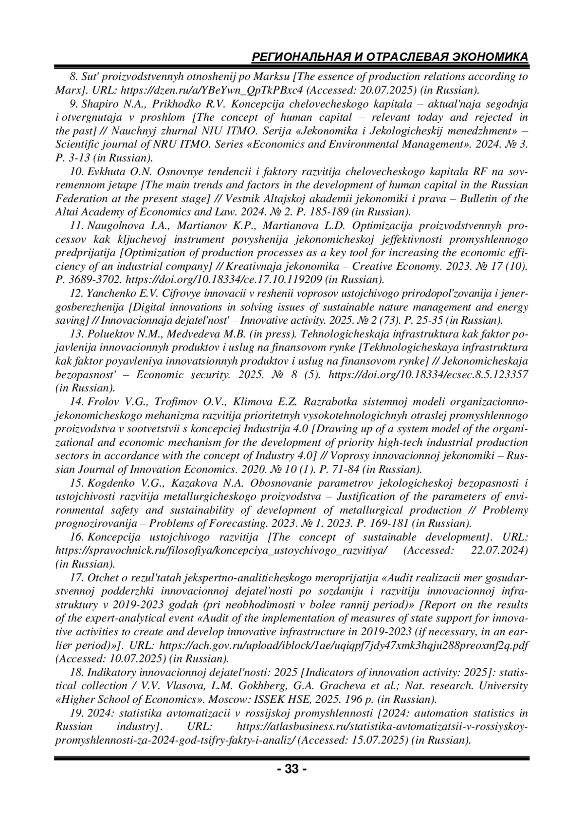 12. Янченко Е.В. Цифровые инновации в решении вопросов устойчивого природопользования и энергосбережения // Инновационная деятельность. 2025. № 2 (73). С. 25-35.