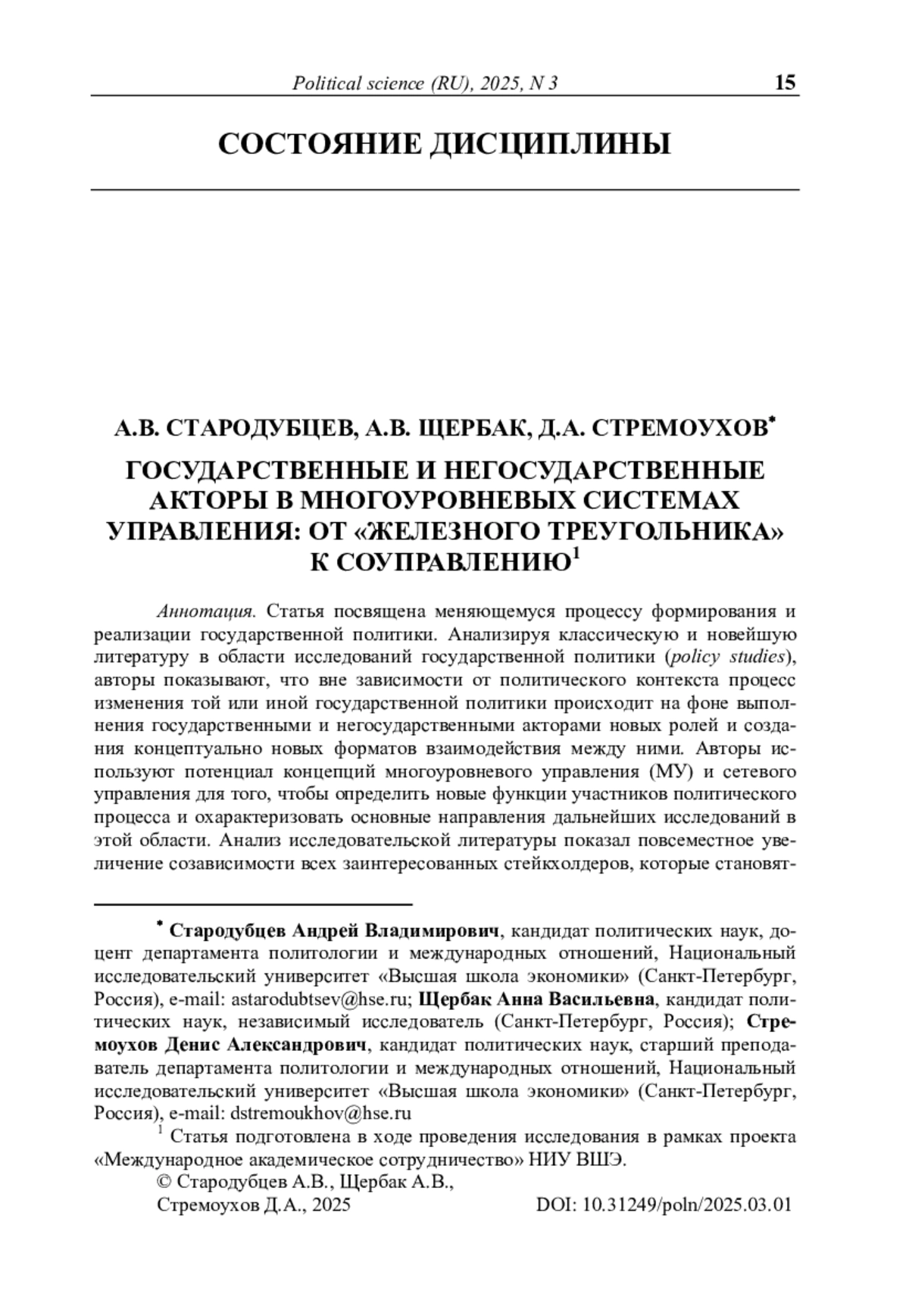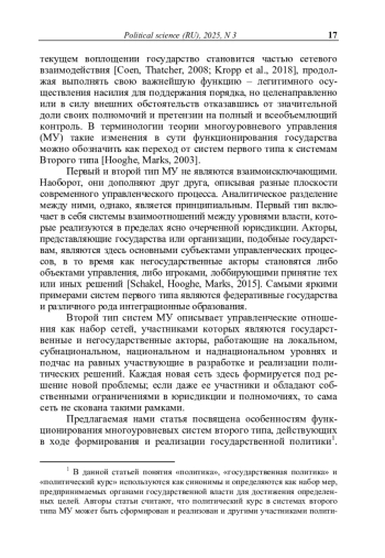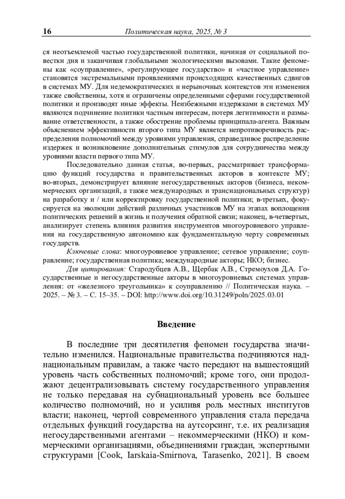 Статья посвящена меняющемуся процессу формирования и реализации государственной политики. Анализируя классическую и новейшую литературу в области исследований государственной политики (policy studies), авторы показывают, что вне зависимости от политического контекста процесс изменения той или иной государственной политики происходит на фоне выполнения государственными и негосударственными акторами новых ролей и создания концептуально новых форматов взаимодействия между ними. Авторы используют потенциал концепций многоуровневого управления (МУ) и сетевого управления для того, чтобы определить новые функции участников политического процесса и охарактеризовать основные направления дальнейших исследований в этой области. Анализ исследовательской литературы показал повсеместное увеличение созависимости всех заинтересованных стейкхолдеров, которые становятся неотъемлемой частью государственной политики, начиная от социальной повестки дня и заканчивая глобальными экологическими вызовами. Такие феномены как «соуправление», «регулирующее государство» и «частное управление» становятся экстремальными проявлениями происходящих качественных сдвигов в системах МУ. Для недемократических и нерыночных контекстов эти изменения также свойственны, хотя и ограничены определенными сферами государственной политики и производят иные эффекты. Неизбежными издержками в системах МУ являются подчинение политики частным интересам, потеря легитимности и размывание ответственности, а также обострение проблемы принципала-агента. Важным объяснением эффективности второго типа МУ является непротиворечивость распределения полномочий между уровнями управления, справедливое распределение издержек и возникновение дополнительных стимулов для сотрудничества между уровнями власти первого типа МУ. Последовательно данная статья, во-первых, рассматривает трансформацию функций государства и правительственных акторов в контексте МУ; во-вторых, демонстрирует влияние негосударственных акторов (бизнеса, некоммерческих организаций, а также международных и транснациональных структур) на разработку и / или корректировку государственной политики; в-третьих, фокусируется на эволюции действий различных участников МУ на этапах воплощения политических решений в жизнь и получения обратной связи; наконец, в-четвертых, анализирует степень влияния развития инструментов многоуровневого управления на государственную автономию как фундаментальную черту современных государств.