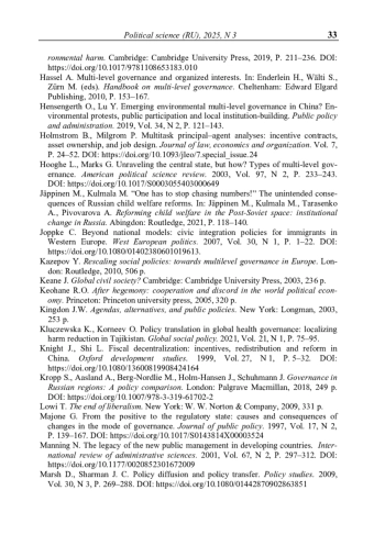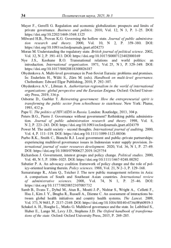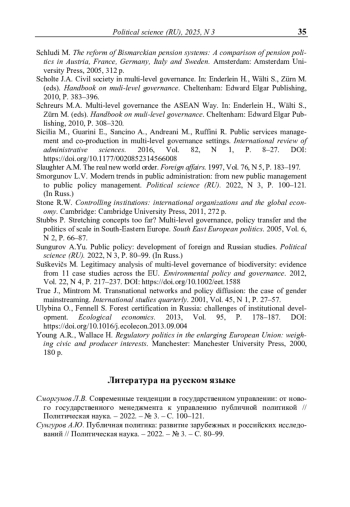1. Сморгунов Л.В. Современные тенденции в государственном управлении: от нового государственного менеджмента к управлению публичной политикой // Политическая наука. - 2022. - № 3. - С. 100-121.