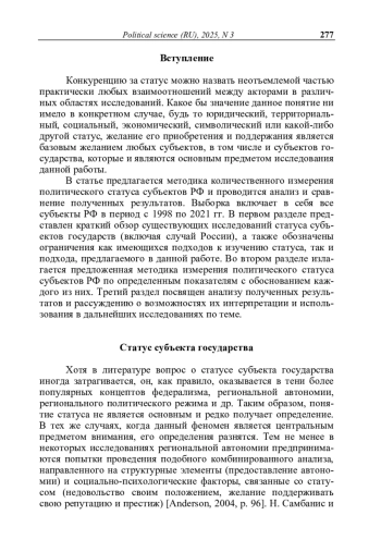 В статье на основе анализа существующих работ на тему статуса субъекта государства и смежных с ней исследований российского федерализма, а также представленного списка показателей статуса, которые включают в себя две основные группы характеристик: формальные нормы и ресурсы (экономические, политические, культурные), предпринимается попытка количественно измерить политический статус субъектов РФ и проанализировать его динамику за период с 1998 по 2021 гг. Несмотря на распространенный тезис о наличии особого положения исключительно у российских республик в 1990–2000-х гг. и о потере данного положения в процессе политики централизации 2000–2010-х гг., проведенный анализ демонстрирует сохранение большинством субъектов РФ своего политического статуса на прежнем уровне, а в некоторых случаях – его повышение, что, однако, оказывается возможным из-за трансформации самого концепта политического статуса в рассматриваемый период, в котором потеря формальных показателей вследствие централизационных процессов компенсируется ростом ресурсных показателей статуса – в первую очередь экономических и культурных.