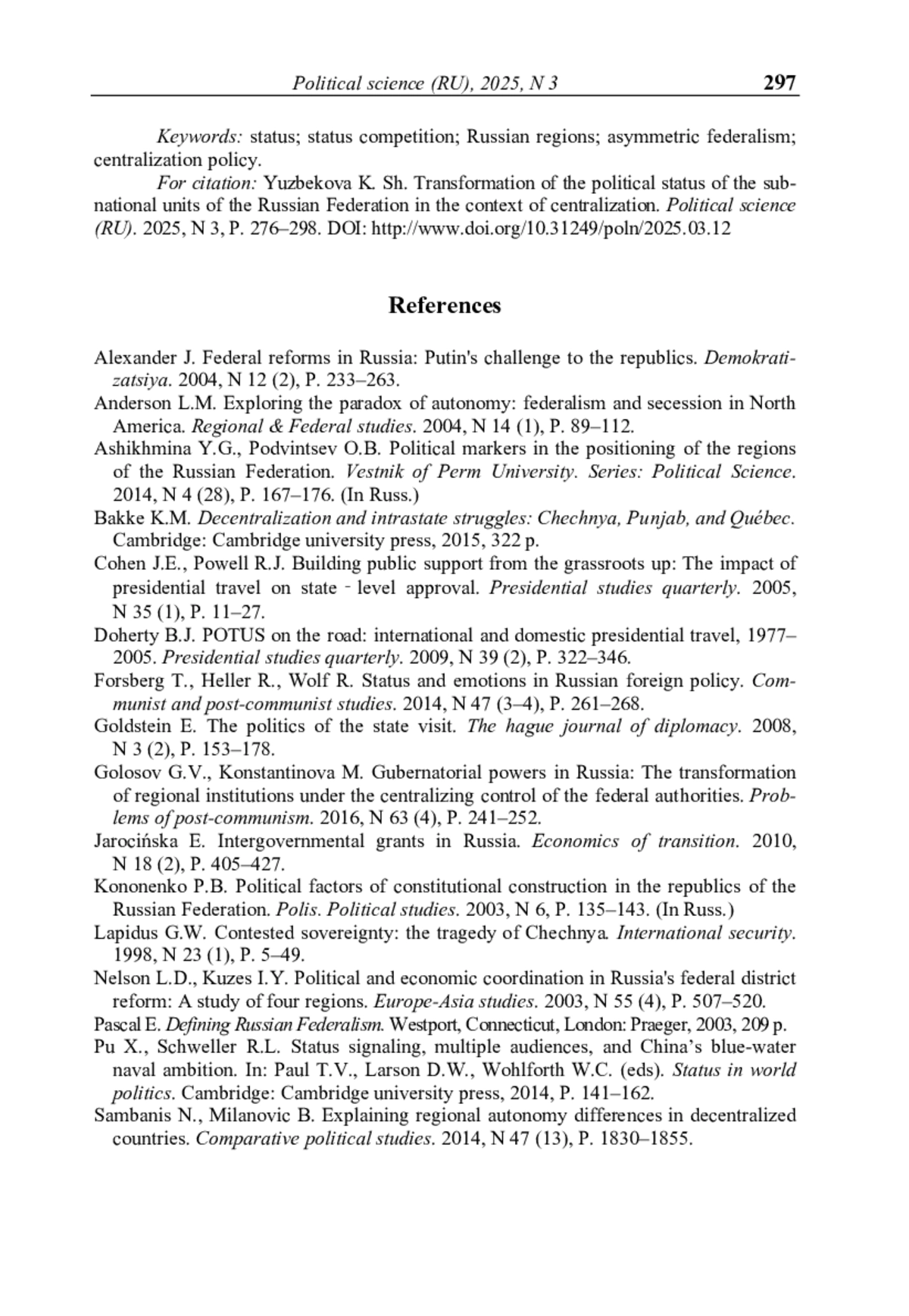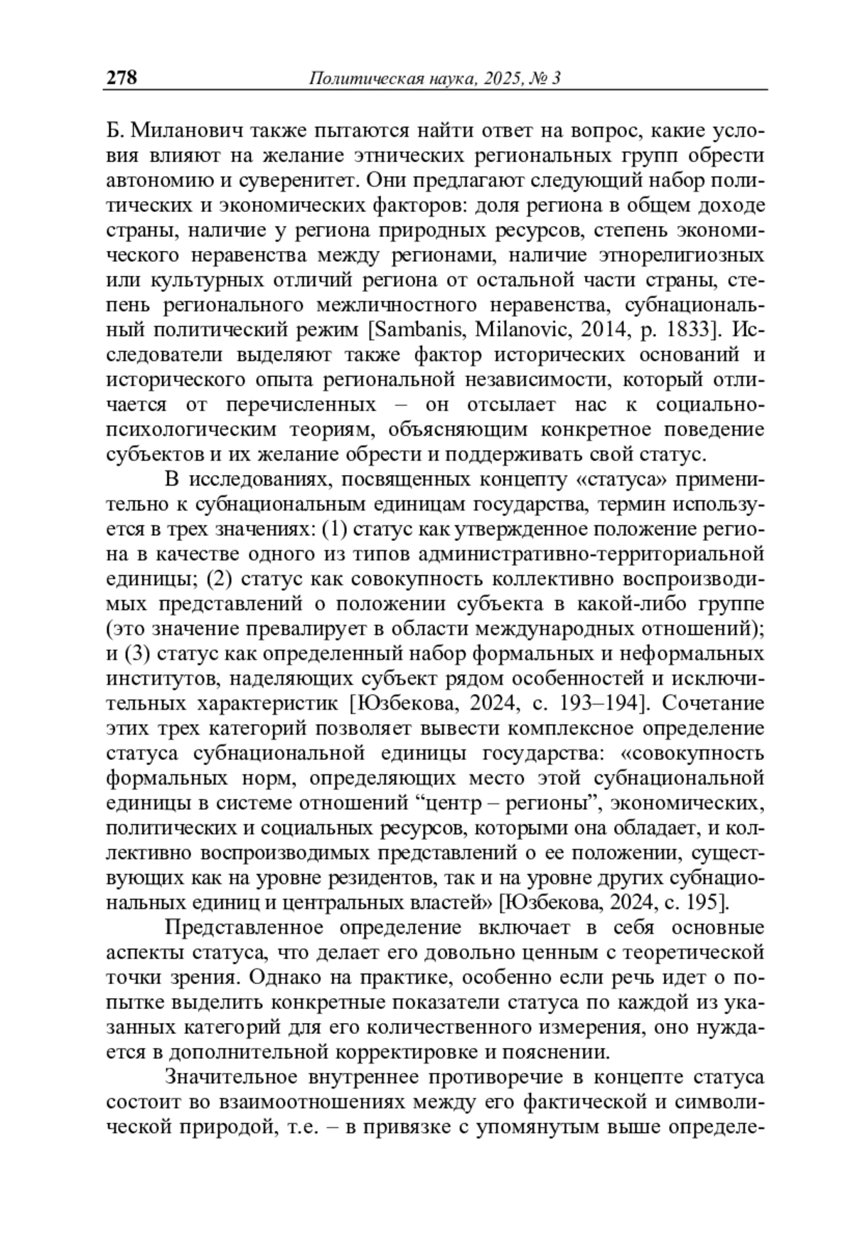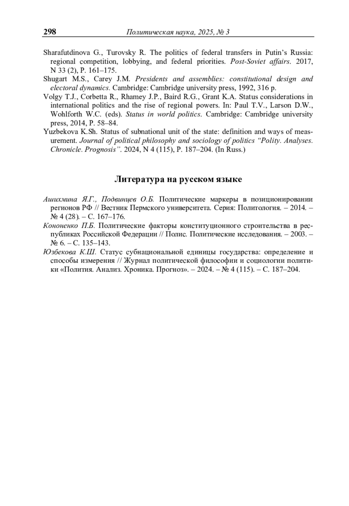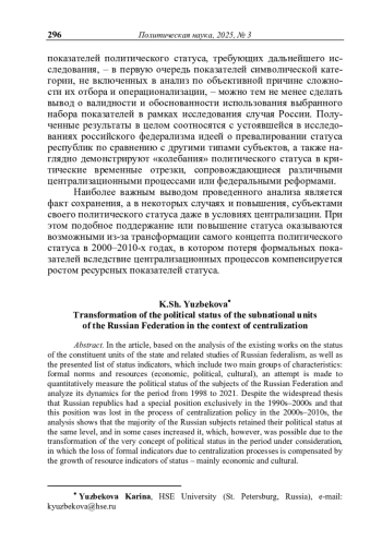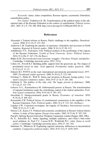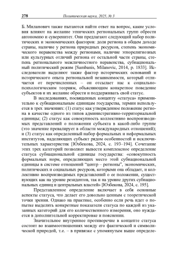 3. Юзбекова К.Ш. Статус субнациональной единицы государства: определение и способы измерения // Журнал политической философии и социологии политики «Полития. Анализ. Хроника. Прогноз». - 2024. - № 4 (115). - С. 187-204.