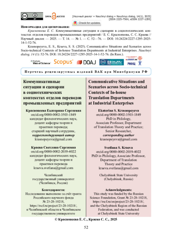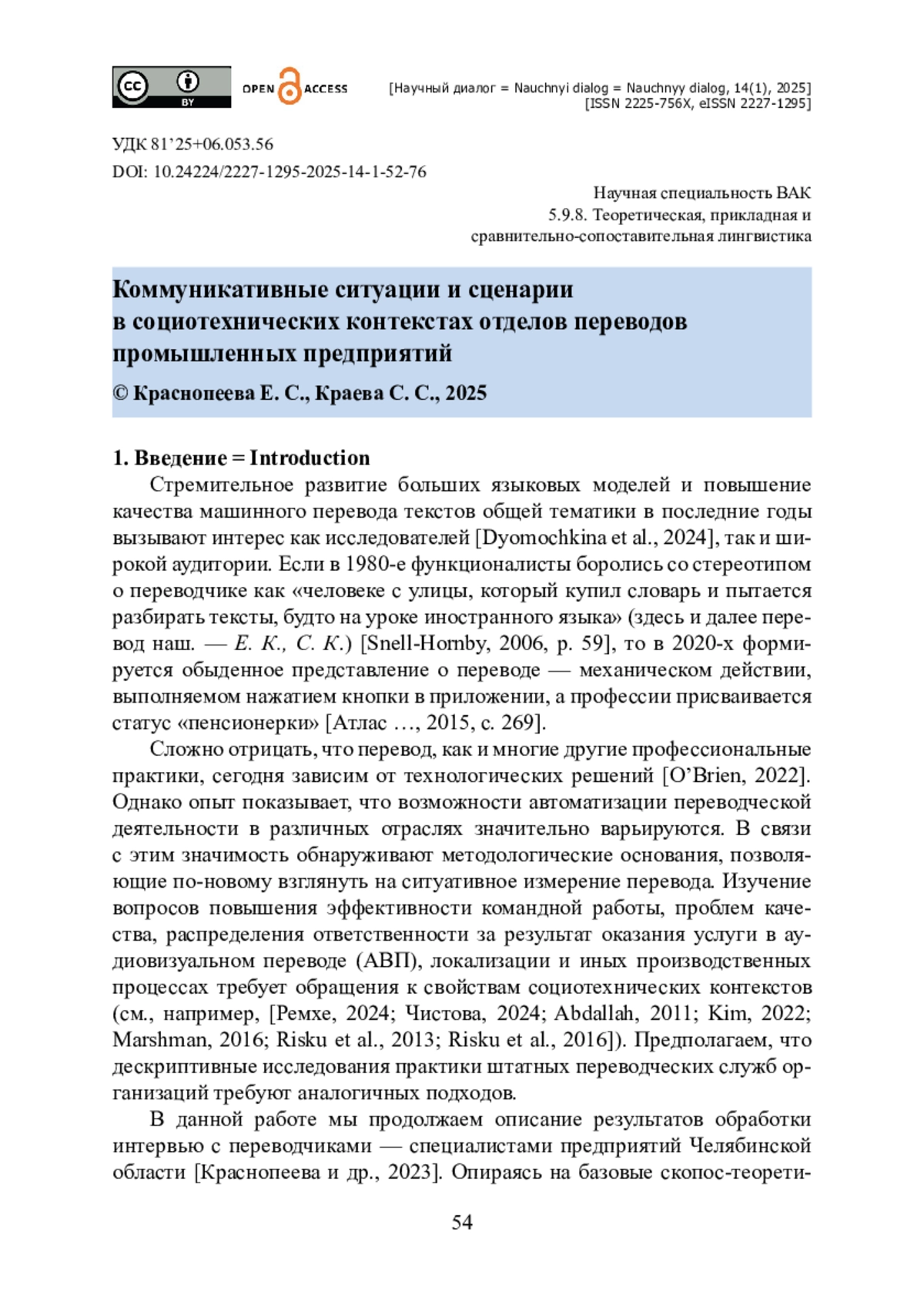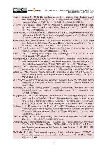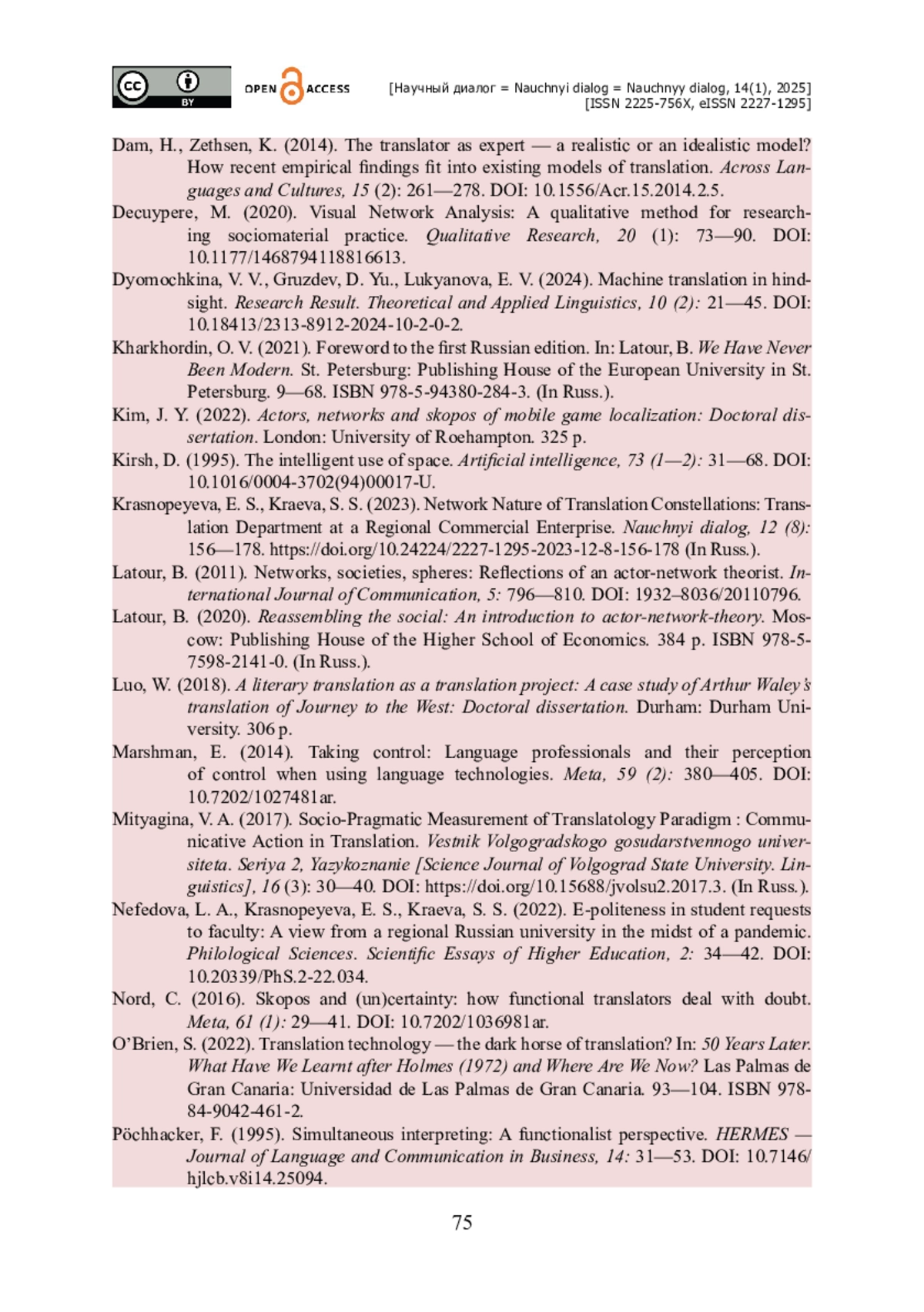 14. Чистова Е. В. Переводческий дизайн как профессиональная когнитивно-коммуникативная деятельность, метод исследования и дидактическая практика (на материале аудиовизуальных произведений) / Е. В. Чистова // Человек : образ и сущность. Гуманитарные аспекты. - 2024. - № 2 (58). - С. 106-122. - https://doi.org/10.31249/chel/2024.02.06.