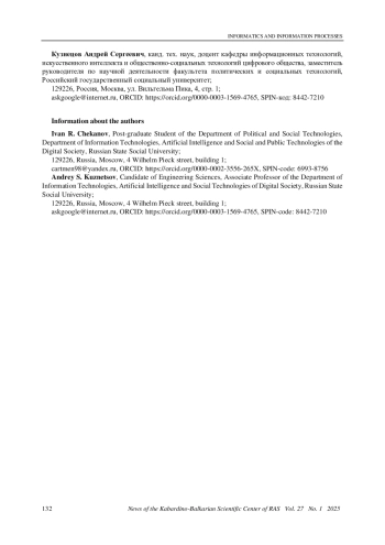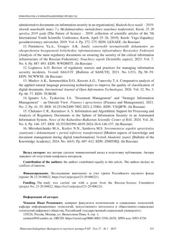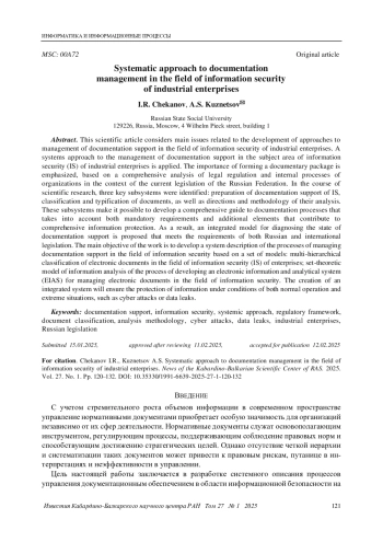15. Чеканов И. Р., Кузнецов А. С. Информационное и алгоритмическое обеспечение обработки и анализа нормативных документов в сфере информационной безопасности в автоматизированной информационной системе // Известия Кабардино-Балкарского научного центра РАН. 2024. Т. 26. № 6. С. 146-157. DOI: 10.35330/1991-6639-2024-26-6-146-157 EDN: FXNFBO