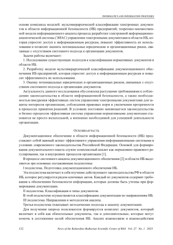 В данной научной статье рассмотрены основные вопросы, касающиеся разработки подходов к управлению документационным обеспечением в области информационной безопасности промышленных предприятий. Применен системный подход к управлению документационным обеспечением в предметной области информационной безопасности (ИБ) промышленных предприятий. Подчеркивается важность формирования документального пакета на основании комплексного анализа нормативно-правового регулирования и внутренних процессов организаций в контексте действующего законодательства Российской Федерации. В ходе проведения научных исследований были выделены три ключевые подсистемы: подготовка документационного обеспечения ИБ, классификация и типизация документов, а также направления и методология их анализа. Эти подсистемы позволяют разработать исчерпывающее руководство по процессам документирования, которое учитывает как обязательные требования, так и дополнительные элементы, способствующие комплексной всесторонней защите информации. В результате предлагается интегрированная модель диагностики состояния документационного обеспечения, отвечающая требованиям как российского, так и международного законодательства. Основной целью работы является разработка системного описания процессов управления документационным обеспечением в области информационной безопасности на основе комплекса моделей: мультииерархической классификации электронных документов в области информационной безопасности (ИБ) предприятий; теоретико-множественной модели информационного анализа процесса разработки электронной информационно-аналитической системы (ЭИАС) управления электронными документами в области ИБ. Создание целостной системы позволит обеспечить защиту информации в условиях как нормальной работы, так и экстремальных ситуаций, таких как кибератаки или утечки данных.