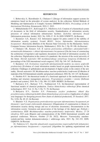 1. Bobrovskiy S., Skorokhodov S., Chekanov I. Design of information support systems for enterprises based on the principles of system analysis // In the collection: Hybrid Methods of Modeling and Optimization in Complex Systems (HMMOCS-II-2023). Proceedings of the II International Workshop. Krasnoyarsk, 2024. С. 2015. EDN: LKYLMG