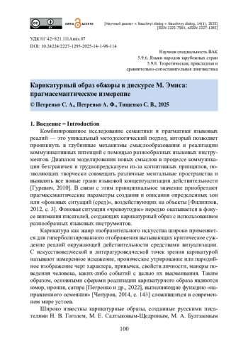 Проведено исследование прагмасемантических аспектов гиперболизированного изображения (карикатуризации) чревоугодия в дискурсивном пространстве романа М. Эмиса «Money: A Suicide Note». Анализируются прямые номинации и метафорически переосмысленные языковые ресурсы, способствующие созданию пародийного образа толстяка и обжоры на уровне предложения и более широкого интратекстуального пространства. Вскрываются глубинные механизмы создания типизированной ситуации обжорства и его последствий. Охарактеризован прием когнитивного диссонанса, способствующий формированию комической фигуры протагониста романа. Подчеркивается итерациональный подход писателя к построению карикатурного архетипичного образа гедониста и обжоры при помощи разнообразных лексико-семантических, стилистических, контекстуально-когнитивных инструментов. Отмечается их высокая дискурсивная плотность. Выявляются когниолингвистические механизмы репрезентации темы чревоугодия в карикатурно-гиперболизированном ключе. Полученные при этом данные открывают новые горизонты для освоения прагмасемантических ресурсов и когнитивно-дискурсивного потенциала вербального воплощения актуальной в современном мире проблемы эгоистичного образа жизни. Определяется коннотативная и эмотивная многомерность карикатурного вербального образа.