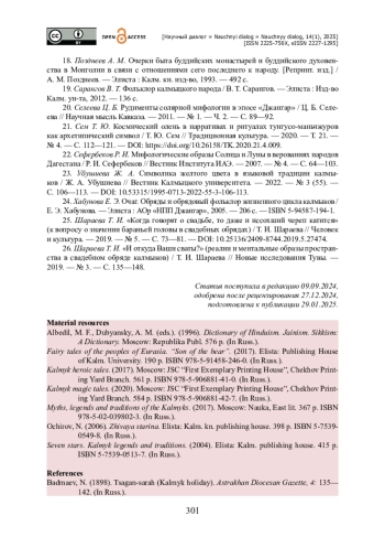 12. Батырева С. Г. Цвет и пространство в традиционной культуре ойратов Монголии и калмыков России / С. Г. Батырева, Д. Гантулга // Secreta Artis. - 2021. - Т. 4. - № 2. - С. 86-95. - https://doi.org/10.51236/2618-7140-2021-4-2-86-95.