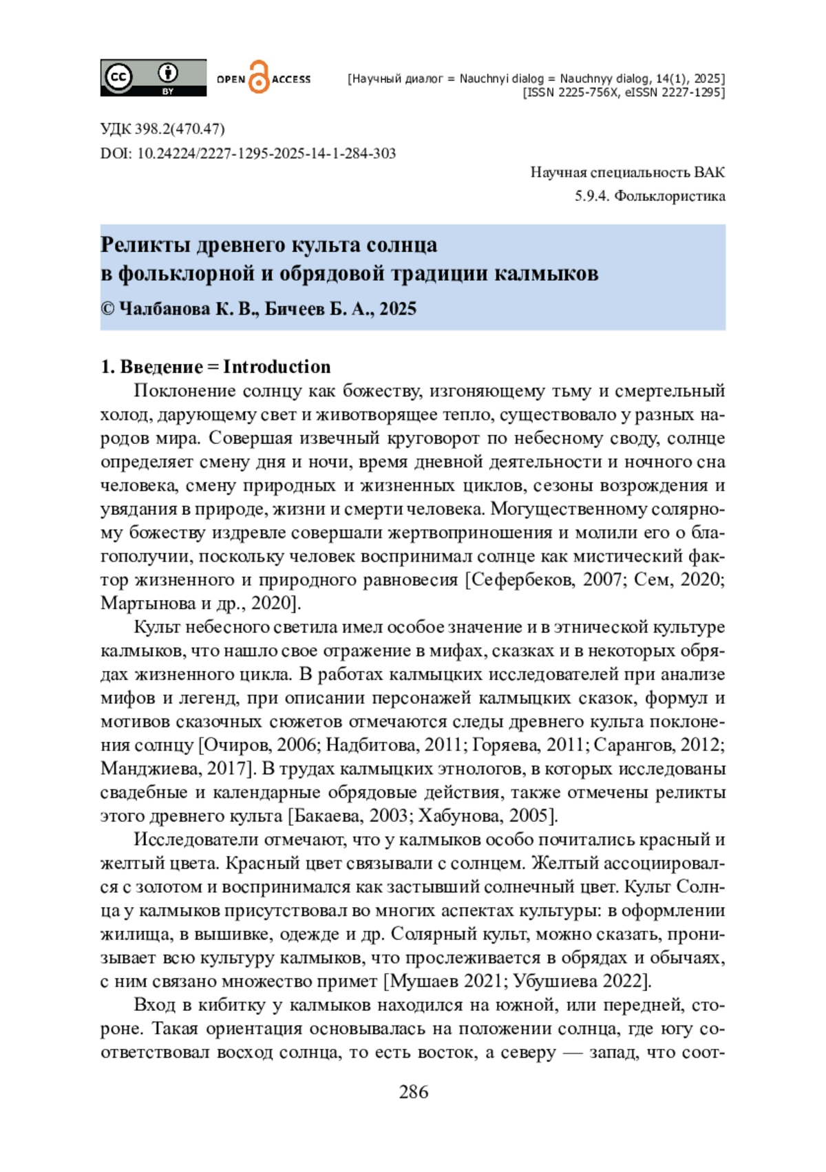 14. Болдырева В. В. К вопросу об ориентации жилища у калмыков / В. В. Болдырева, А. Б. Лиджиев // Вестник Института комплексных исследований аридных территорий. - 2019. - № 1 (38). - С. 127-129.
