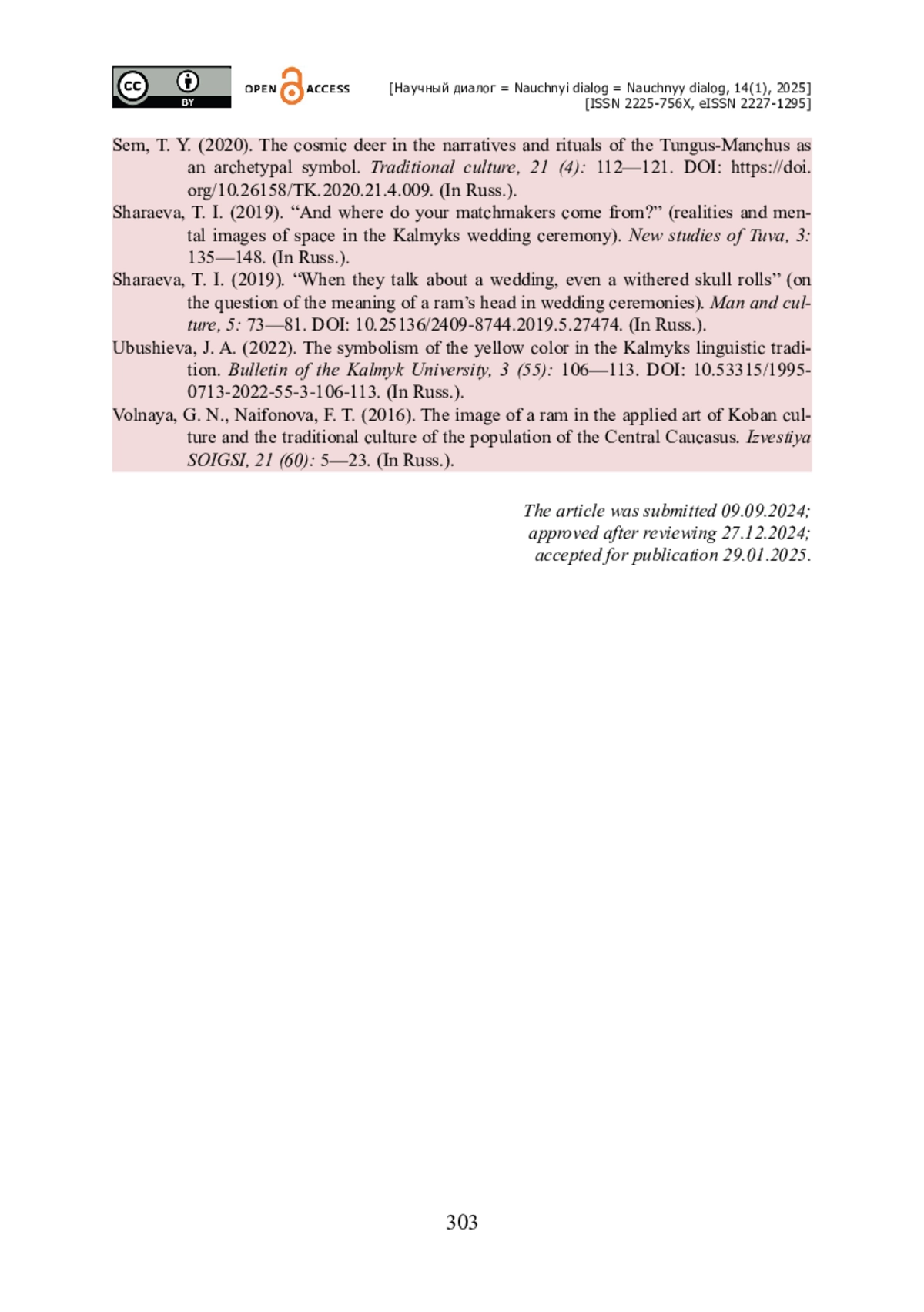 32. Шараева Т. И. «Когда говорят о свадьбе, то даже и иссохший череп катится» (к вопросу о значении бараньей головы в свадебных обрядах) / Т. И. Шараева // Человек и культура. - 2019. - № 5. - С. 73-81. - https://doi.org/10.25136/2409-8744.2019.5.27474.