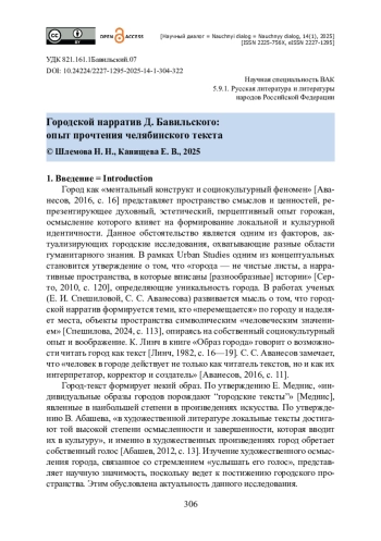 Статья посвящена изучению особенностей создания городского нарратива в творчестве челябинского писателя Дмитрия Бавильского. Целью работы стало выявление специфических вариантов прочтения городского текста на материале цикла «Существительное». Методологической основой исследования послужило обращение к основам нарратологии, подходам геопоэтики и принципам ментального картографирования, позволяющим определить уникальность видения образа города. Доказано, что городской нарратив в цикле Д. Бавильского «Существительное» позволяет акцентировать особый хронотоп города, описываемый через положение окраины: Чердачинск (название, соотносительное с Челябинск) находится на границе определенного географического локуса и в то же время на границе миров. Авторы статьи подчеркивают, что город в произведениях Д. Бавильского соотносится с образом героя, пытающегося осмыслить собственное «я» через восприятие пространства, описать состояние «вненаходимости», заполнить его субъетивными ценностными характеристиками. Отмечается, что ведущим приемом построения текста Д. Бавильского является антитеза. Анализ исследуемого материала позволил дополнить традиции изучения челябинского текста и творчества Д. Бавильского, охарактеризовать высокий уровень рефлексии образа города в творчестве писателя.