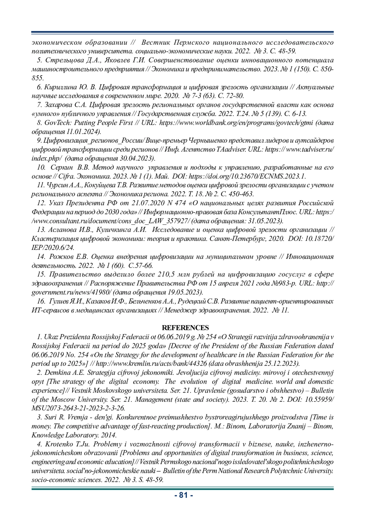 Рассматриваются особенности внедрения новых цифровых организационно- технических решений в реализации клиенто- ориентированных подходов к системе услуг оказания медицинской помощи населению. Инновационные подходы в данной традиционно консервативной отрасли обеспечивают равноправное и эффективное информационное взаимодействия между участниками лечебной деятельности в контуре медклиника-врач- пациент. Продвинутая цифровая зрелость управляющей клиниками организационно- экономической системы эффективно поддерживает содержательные основы специфической врачебной деятельности и повышает степень доступности и удовлетворенности людей оказанной услугой. Цель исследования - рассмотреть основные тенденции цифрового развития сферы национального здравоохранения и разработать экономико-управленческие инструменты продвижения цифровой зрелости организаций, их оценки и дальнейшего совершенствования. Предложены методические подходы для оценки цифровой зрелости организаций на основе применения количественных и качественных показателей вотношении факторов внутреннего и внешнего (независимого) характера. Среди управляемых компонент рекомендуется выделять факторы научно-технического и организационно-экономического порядка и особенно организационную культуру. Основные результаты проведенного исследования: проведен анализ теоретических подходов к оценке цифровой зрелости медицинских организаций, предложена система показателей, учитывающих отраслевые аспекты, и разработан алгоритм оценки общей цифровой зрелости организаций и соответствующей интерпретации результатов в целях применения необходимых управляющих воздействий для повышения степени удовлетворенности нужд целевых клиентов (пациентов).