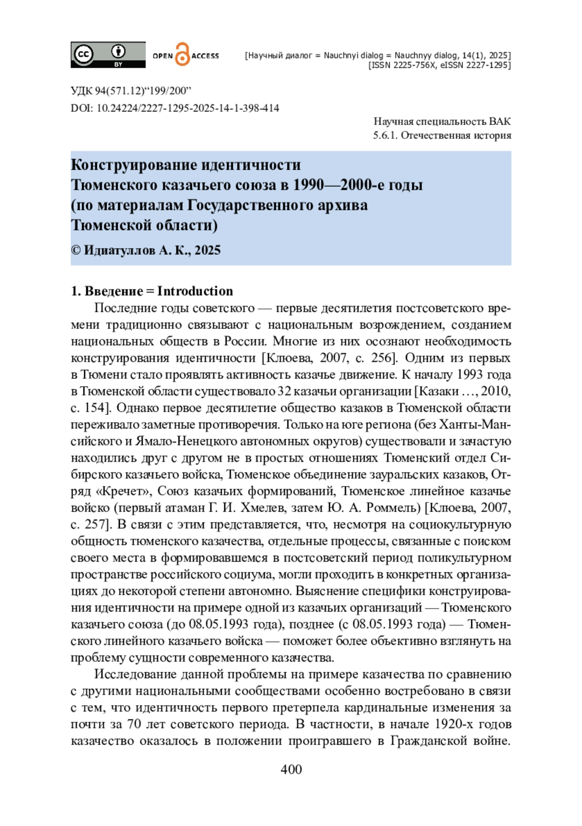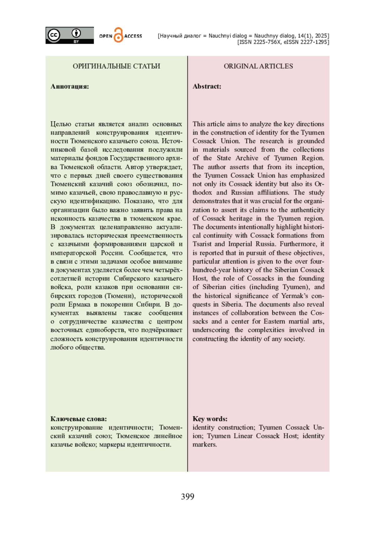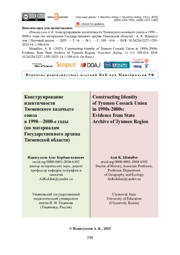 Целью статьи является анализ основных направлений конструирования идентичности Тюменского казачьего союза. Источниковой базой исследования послужили материалы фондов Государственного архива Тюменской области. Автор утверждает, что с первых дней своего существования Тюменский казачий союз обозначил, помимо казачьей, свою православную и русскую идентификацию. Показано, что для организации было важно заявить права на исконность казачества в тюменском крае. В документах целенаправленно актуализировалась историческая преемственность с казачьими формированиями царской и императорской России. Сообщается, что в связи с этими задачами особое внимание в документах уделяется более чем четырёхсотлетней истории Сибирского казачьего войска, роли казаков при основании сибирских городов (Тюмени), исторической роли Ермака в покорении Сибири. В документах выявлены также сообщения о сотрудничестве казачества с центром восточных единоборств, что подчёркивает сложность конструирования идентичности любого общества.
