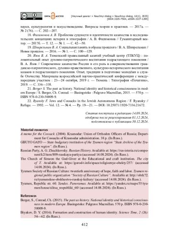 20. Рябова Е. Л. Православные основы самоидентификации российского казачества : история и современность / Е. Л. Рябова, Л. О. Терновая // Казачество. - 2019. - № 38 (2). - С. 35-44.