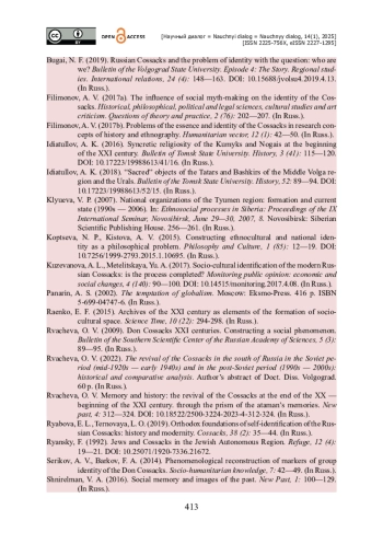 8. Бугай Н. Ф. Российское казачество и проблема идентичности с вопросом : кто мы? / Н. Ф. Бугай // Вестник Волгоградского государственного университета. Серия 4 : История. Регионоведение. Международные отношения. - 2019. - Т. 24. - № 4. - С. 148-163. - https://doi.org/10.15688/jvolsu4.2019.4.13.