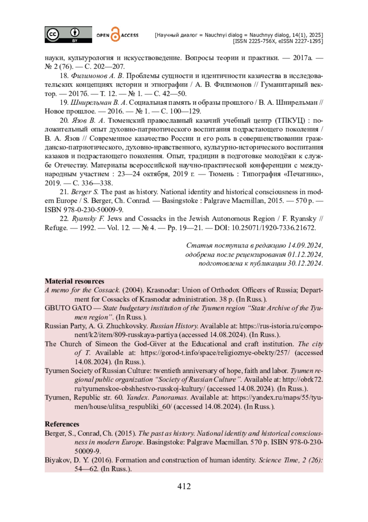 19. Рвачева О. В. Память и история: возрождение казачества в конце ХХ - начале XXI веков сквозь призму воспоминаний атамана / О. В. Рвачева // Новое прошлое. - 2023. - № 4. - С. 312-324. - https://doi.org/10.18522/2500-3224-2023-4-312-324.