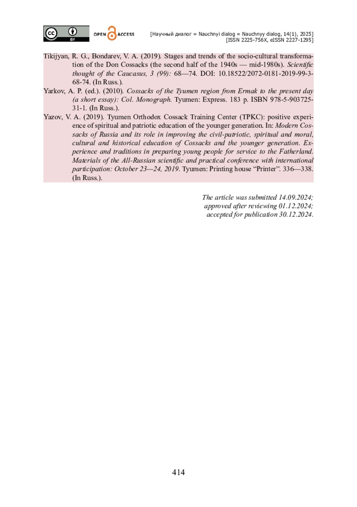 22. Тикиджьян Р. Г. Этапы и тенденции социокультурной трансформации донского казачества (вторая половина 1940-х - середина 1980-х годов) / Р. Г. Тикиджьян, В. А. Бондарев // Научная мысль Кавказа. - 2019. - № 3 (99). - С. 68-74. - https://doi.org/10.18522/2072-0181-2019-99-3-68-74.