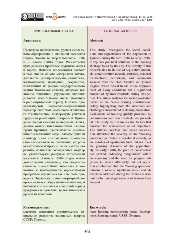 Проведено исследование уровня социального обустройства и ожиданий населения города Тюмени во второй половине 1970- х — начале 1980-х годов. Рассмотрены пути решения проблемы дефицита жилья в городе. Новизна исследования состоит в том, что на основе материалов законодательства, делопроизводства, статистики, воспоминаний, периодики, документов, извлеченных из фондов Государственного архива Тюменской области, авторами выявлены тенденции улучшения бытовых условий значительного числа тюменцев в рассматриваемый период. В статье проанализирован социально-направленный характер политики «массового жилищного строительства», подчеркнуты успехи и трудности реализации программы. Приведены оценки качества возводимого жилья, данные комиссиями и новоселами. Рассмотрены причины, сдерживавшие реализацию поставленных задач. Авторы пришли к выводу о том, что панельное строительство способствовало смягчению остроты «квартирного вопроса», но не смогло его решить, количество возведенных квартир не удовлетворяло растущие потребности населения. В начале 1980-х годов темпы домостроения снизились, что свидетельствовало о «застойных явлениях» в экономике и необходимости корректировки программы, однако она так и не была проведена. Подчеркнуто, что «квартирный вопрос» является общественно-значимым, и попытки его решения в советский период нуждаются в изучении с целью извлечения уроков из прошлого.