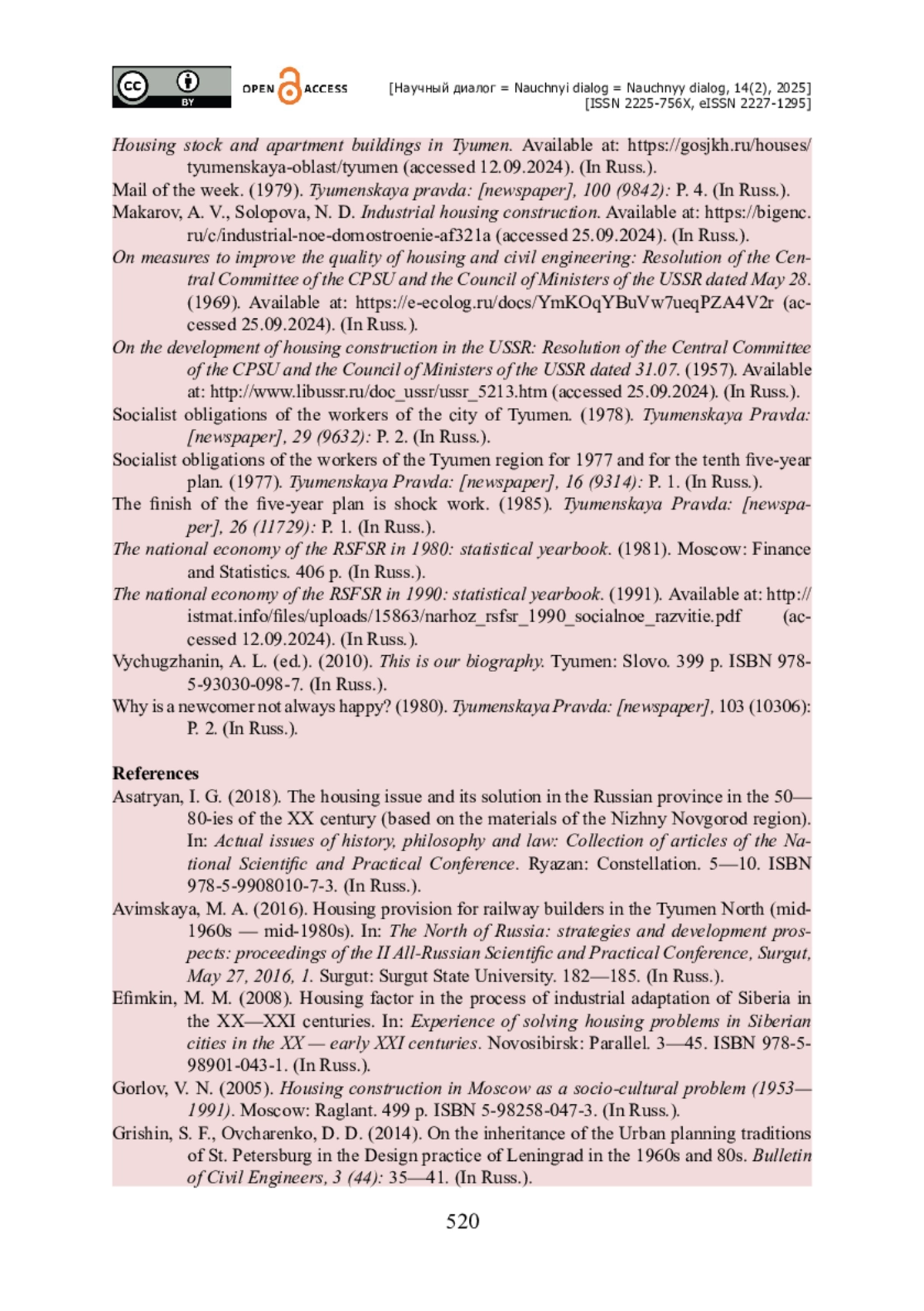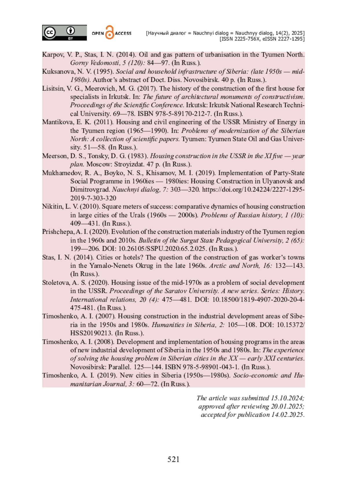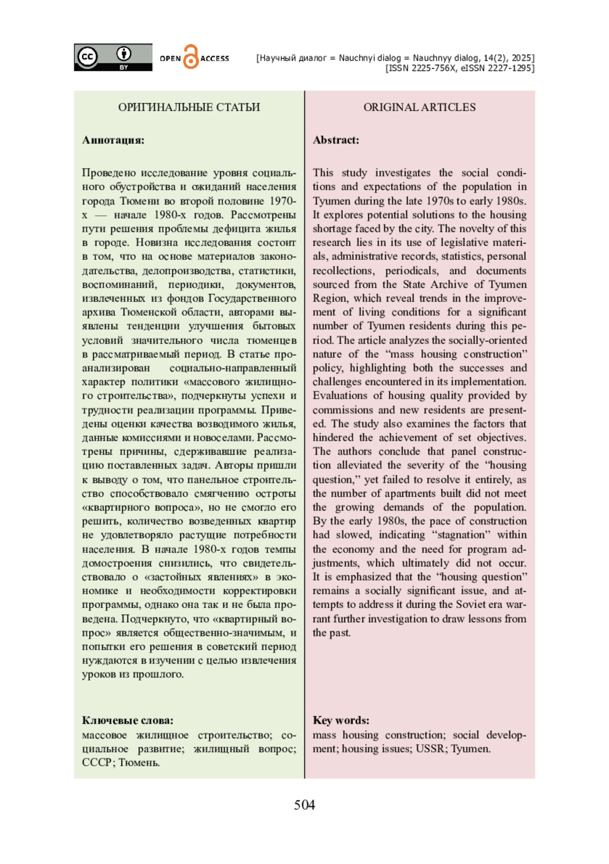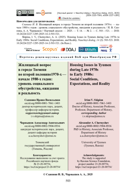 СКИПИНА И. В., ЧЕРНЫШЕВ А. А. ЖИЛИЩНЫЙ ВОПРОС В ГОРОДЕ ТЮМЕНИ ВО ВТОРОЙ ПОЛОВИНЕ 1970-Х — НАЧАЛЕ 1980-Х ГОДОВ: УРОВЕНЬ СОЦИАЛЬНОГО ОБУСТРОЙСТВА, ОЖИДАНИЯ И РЕАЛЬНОСТЬ // НАУЧНЫЙ ДИАЛОГ. 2025. ТОМ 14, № 2