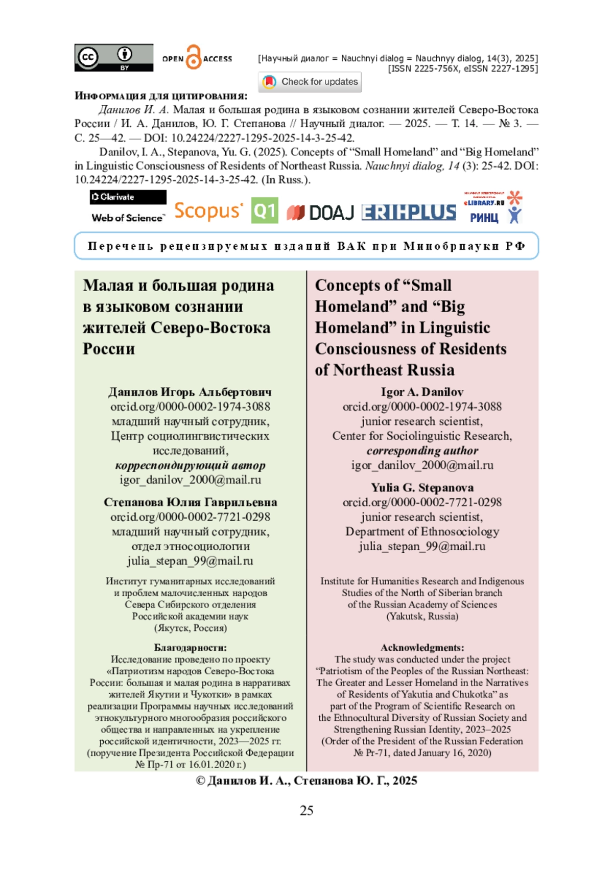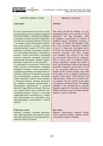 В статье представлены результаты психолингвистического исследования концептов МАЛАЯ РОДИНА и БОЛЬШАЯ РОДИНА в языковом сознании жителей Северо-Востока России на примере Якутии и Чукотки. С помощью метода субъективной дефиниции, реализованного в рамках массового социологического опроса (N=1434), были выявлены ключевые смысловые доминанты и коннотации, связанные с данными понятиями. Анализ полученных ассоциаций позволил выделить основные категории, отражающие различные уровни территориальной идентичности респондентов — от глобального до локального. Особое внимание уделено региональной специфике языкового сознания, а также возрастным и гендерным различиям в интерпретации изучаемых концептов. Результаты исследования демонстрируют сложную многоуровневую структуру понятий «малая родина» и «большая родина», которые выступают как маркеры локальной, региональной и гражданской идентичности в сознании жителей Северо-Востока России. Полученные данные вносят вклад в развитие психолингвистического подхода к изучению территориальной идентичности и открывают перспективы для дальнейших междисциплинарных исследований в данной области.