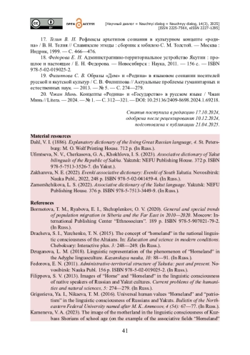 19. Филиппова С. В. Образы «Дом» и «Родина» в языковом сознании носителей русской и якутской культур / С. В. Филиппова // Актуальные проблемы гуманитарных и естественных наук. - 2013. - № 5. - С. 274-279.