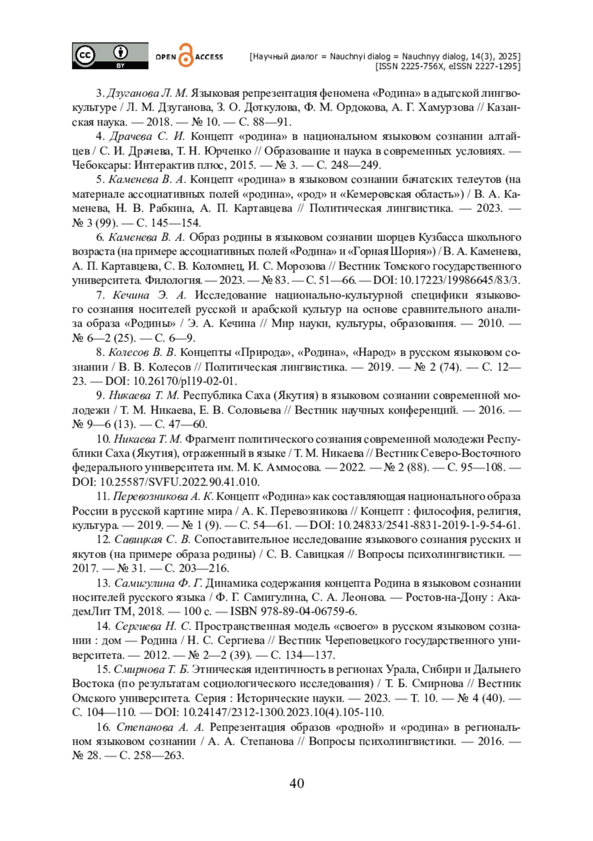 16. Степанова А. А. Репрезентация образов «родной» и «родина» в региональном языковом сознании / А. А. Степанова // Вопросы психолингвистики. - 2016. - № 28. - С. 258-263.
