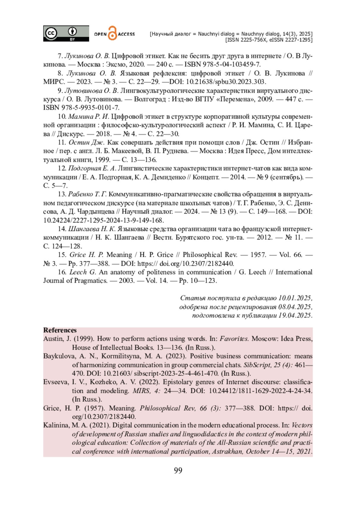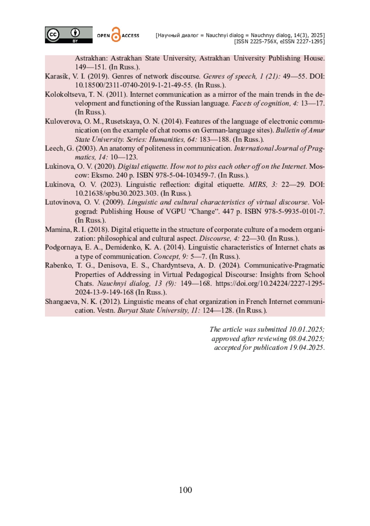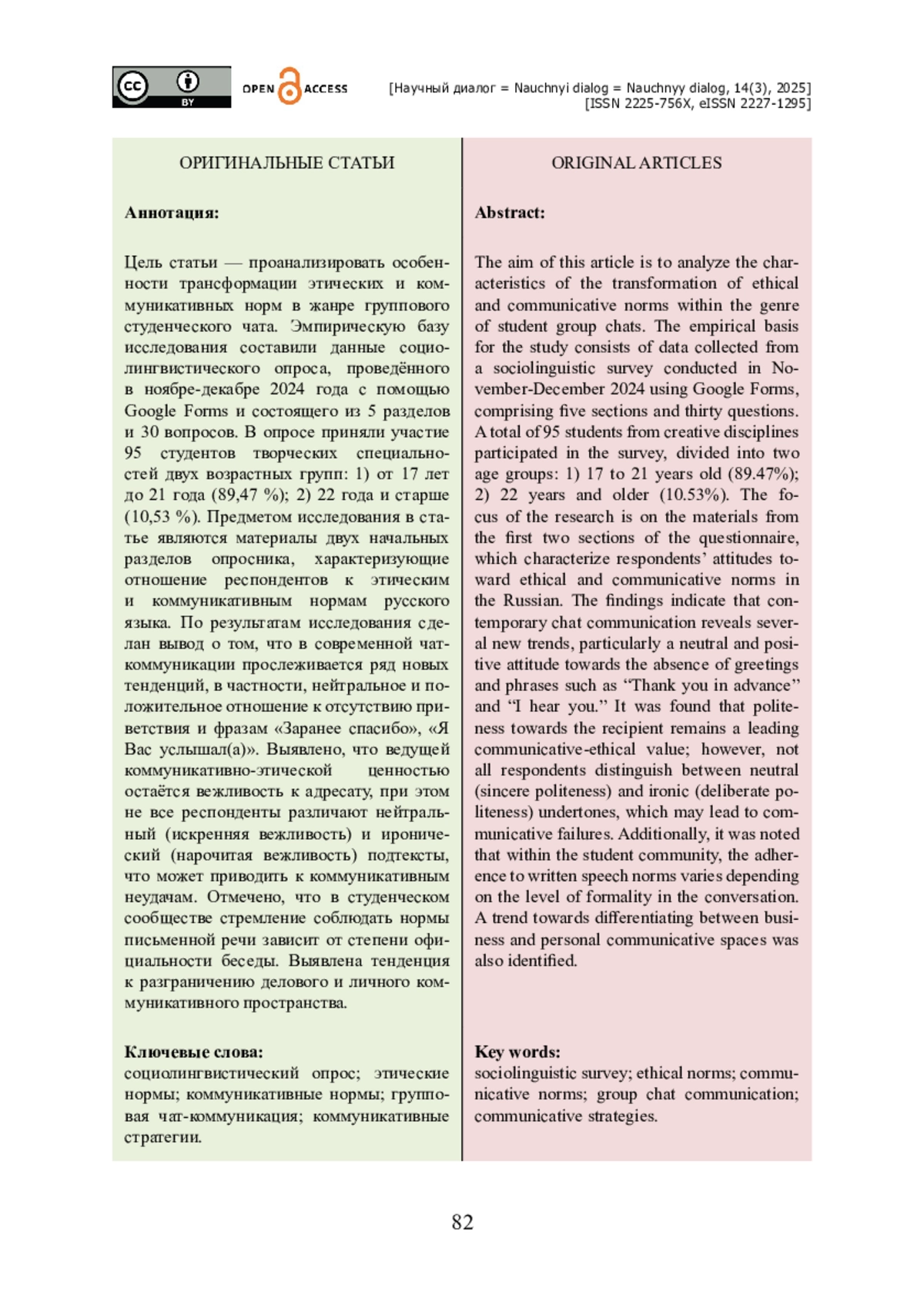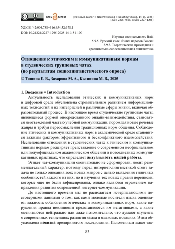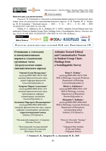 ТИШИНА Е. В., ЗАХАРОВА М. А. ОТНОШЕНИЕ К ЭТИЧЕСКИМ И КОММУНИКАТИВНЫМ НОРМАМ В СТУДЕНЧЕСКИХ ГРУППОВЫХ ЧАТАХ (ПО РЕЗУЛЬТАТАМ СОЦИОЛИНГВИСТИЧЕСКОГО ОПРОСА) // НАУЧНЫЙ ДИАЛОГ. 2025. ТОМ 14, № 3