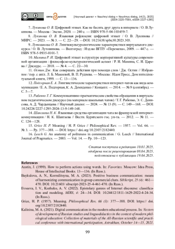 Цель статьи — проанализировать особенности трансформации этических и коммуникативных норм в жанре группового студенческого чата. Эмпирическую базу исследования составили данные социолингвистического опроса, проведённого в ноябре-декабре 2024 года с помощью Google Forms и состоящего из 5 разделов и 30 вопросов. В опросе приняли участие 95 студентов творческих специальностей двух возрастных групп: 1) от 17 лет до 21 года (89,47 %); 2) 22 года и старше (10,53 %). Предметом исследования в статье являются материалы двух начальных разделов опросника, характеризующие отношение респондентов к этическим и коммуникативным нормам русского языка. По результатам исследования сделан вывод о том, что в современной чат-коммуникации прослеживается ряд новых тенденций, в частности, нейтральное и положительное отношение к отсутствию приветствия и фразам «Заранее спасибо», «Я Вас услышал(а)». Выявлено, что ведущей коммуникативно-этической ценностью остаётся вежливость к адресату, при этом не все респонденты различают нейтральный (искренняя вежливость) и иронический (нарочитая вежливость) подтексты, что может приводить к коммуникативным неудачам. Отмечено, что в студенческом сообществе стремление соблюдать нормы письменной речи зависит от степени официальности беседы. Выявлена тенденция к разграничению делового и личного коммуникативного пространства.