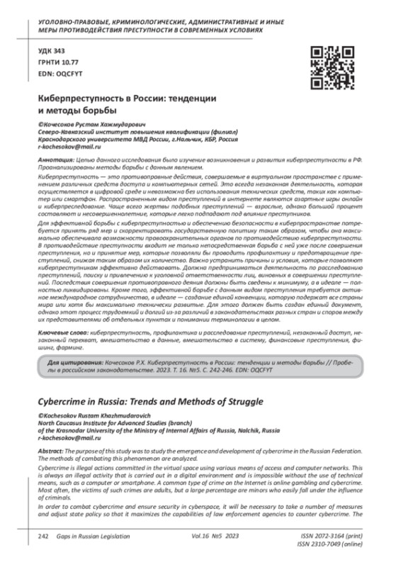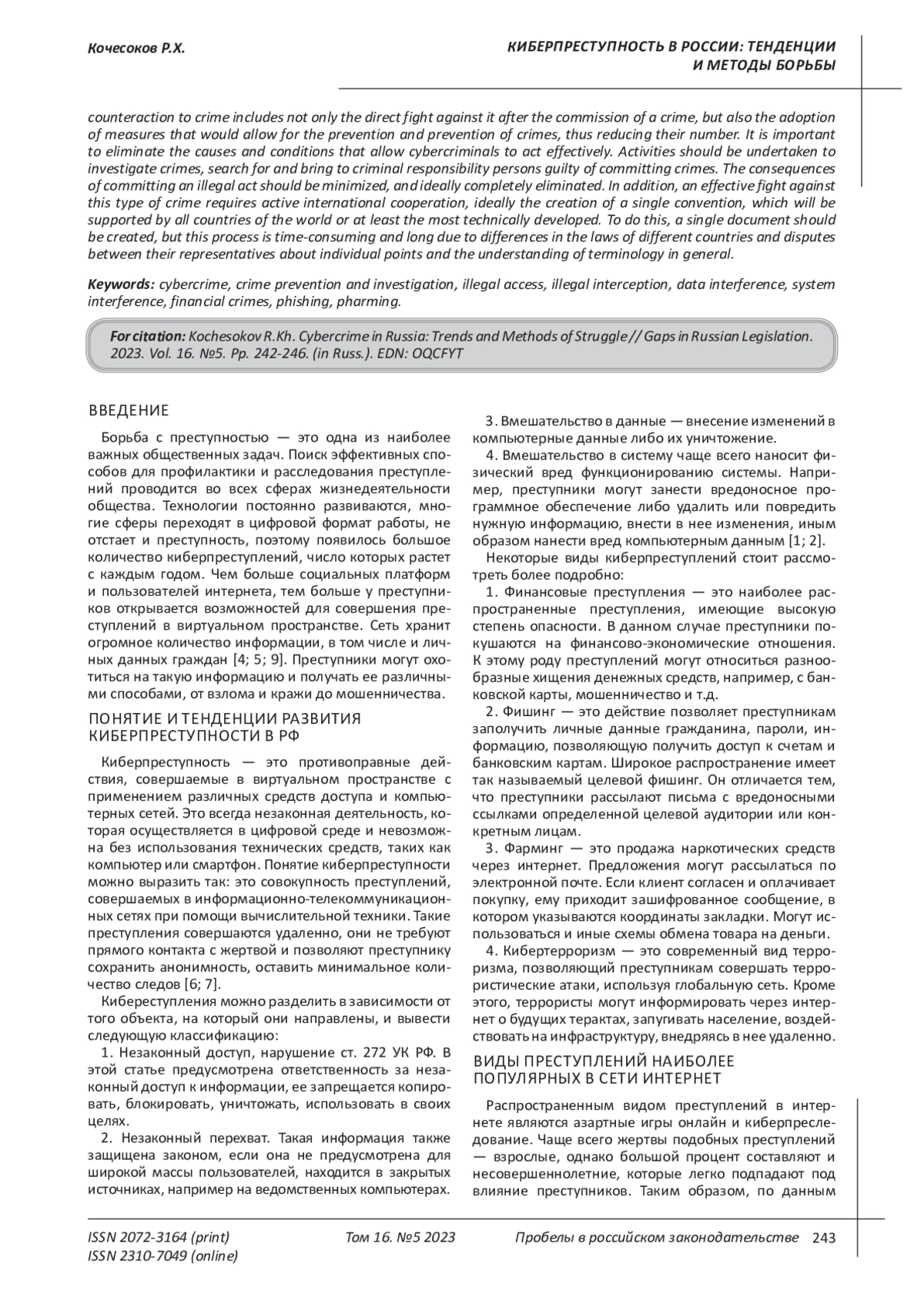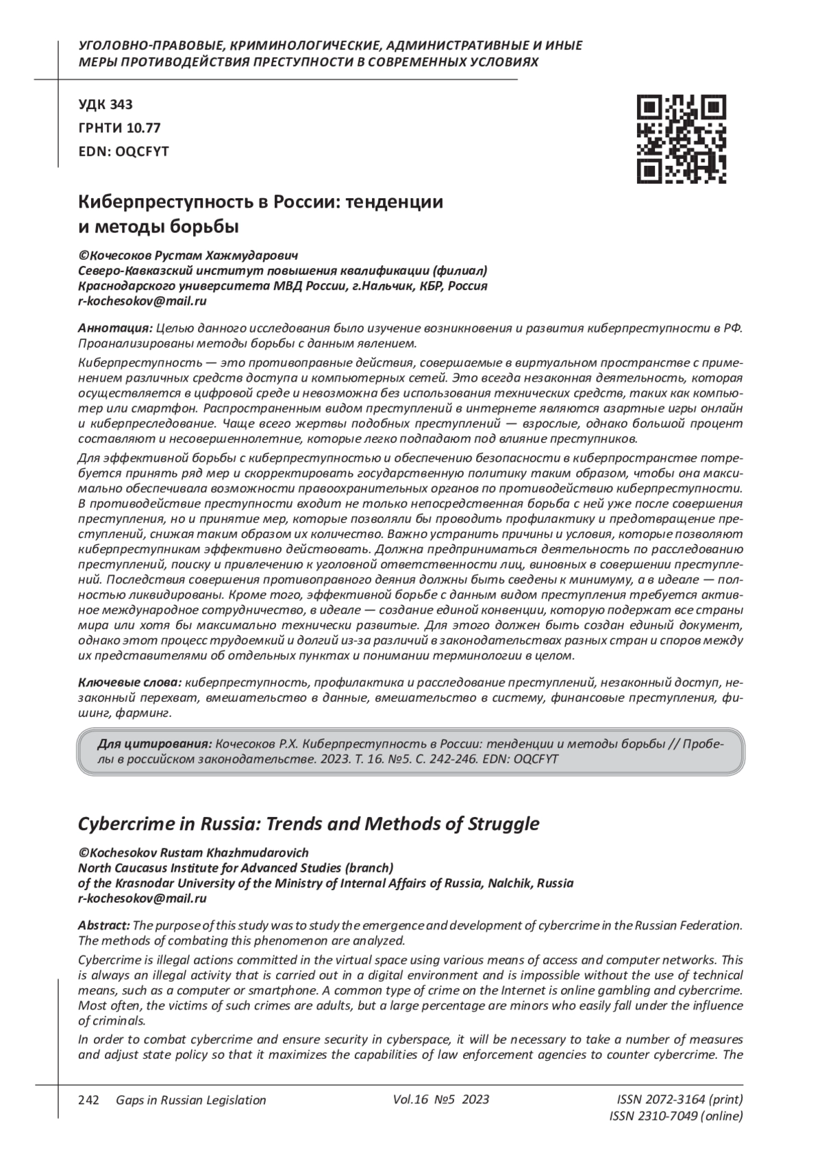 Shikula I.R., Kurkin E.N. Cybercrime in the Russian Federation: basic methods of struggle and problems of counteraction // International Journal of Experimental Education. 2023. No. 1. pp. 37-41. EDN: CESTGI