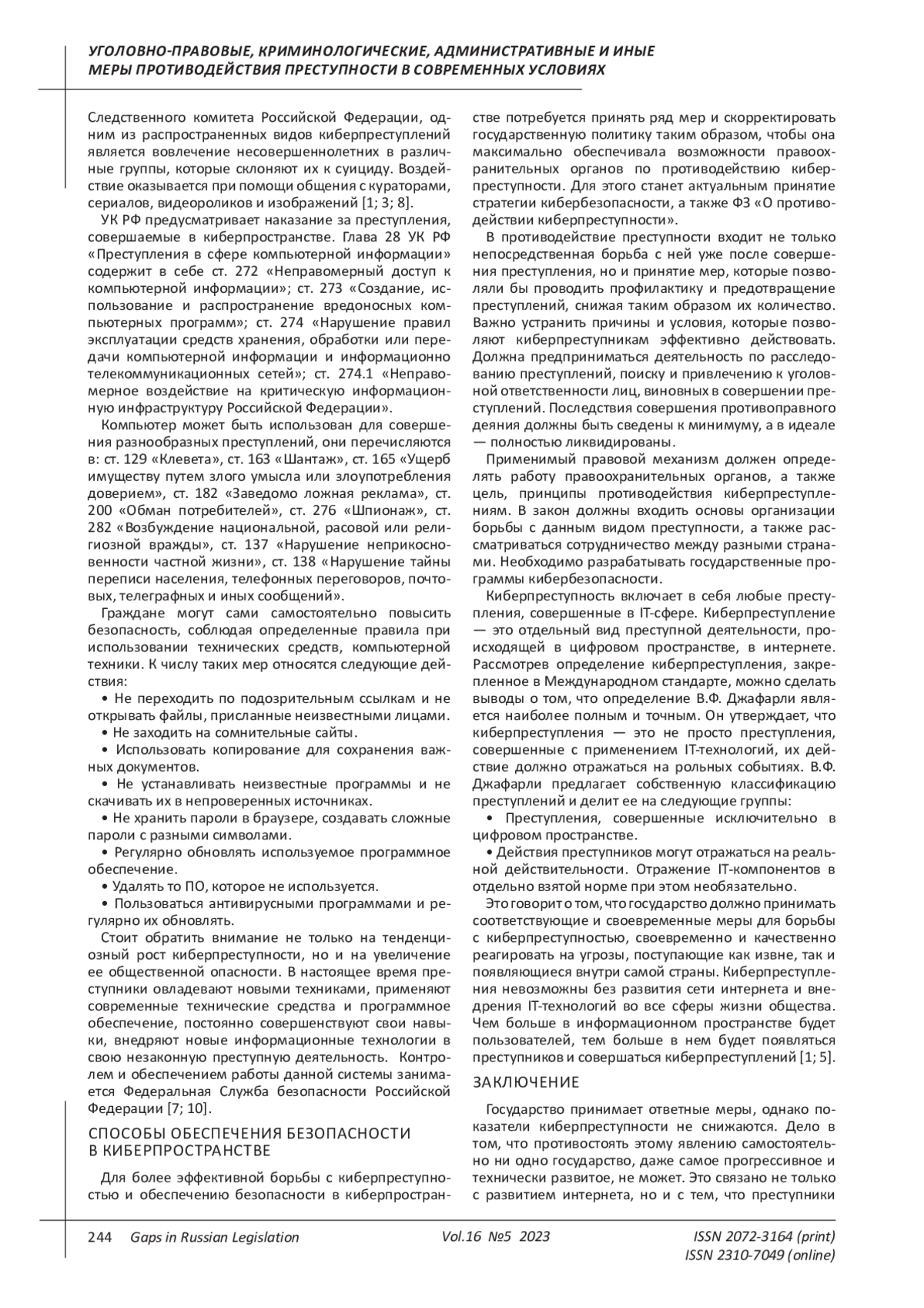 6. Теуважуков А.Х. Некоторые проблемы выявления и предупреждения преступлений, совершаемых в киберпространстве // Журнал прикладных исследований. 2023. № 4. С. 152-155. EDN: MJHTEC