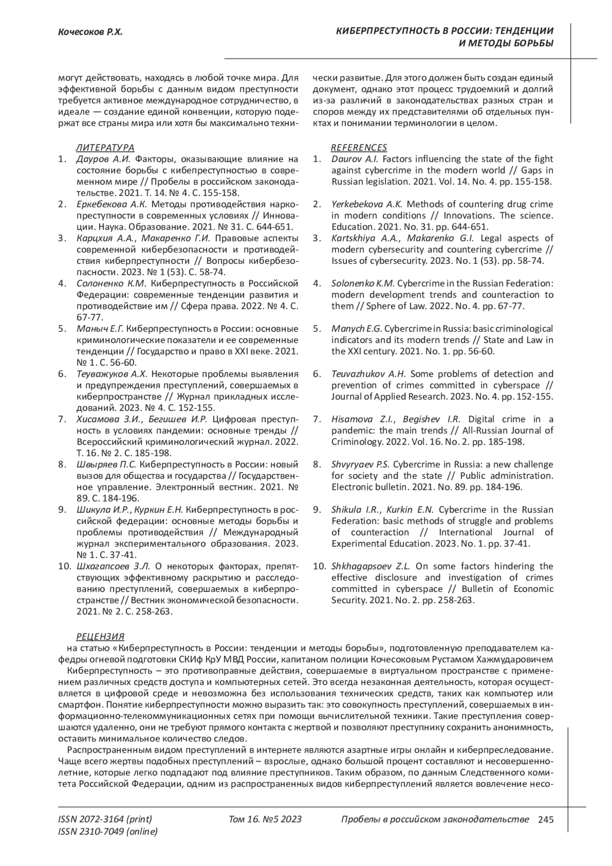 9. Шикула И.Р., Куркин Е.Н. Киберпреступность в российской федерации: основные методы борьбы и проблемы противодействия // Международный журнал экспериментального образования. 2023. № 1. С. 37-41. EDN: CESTGI