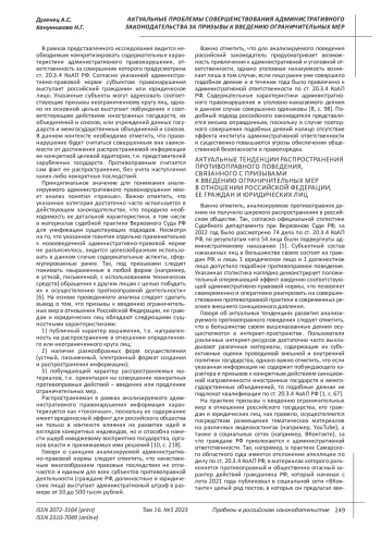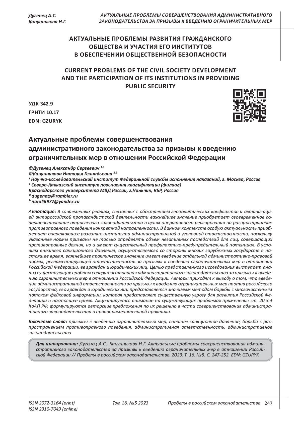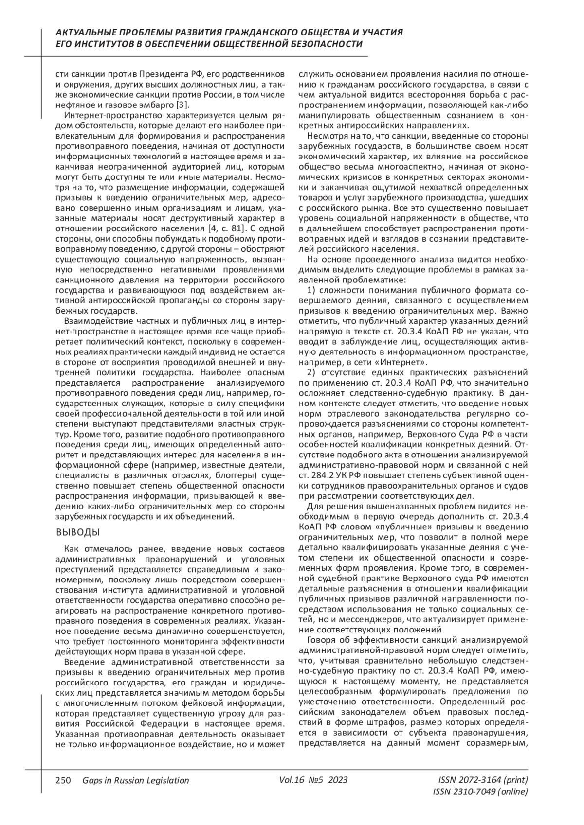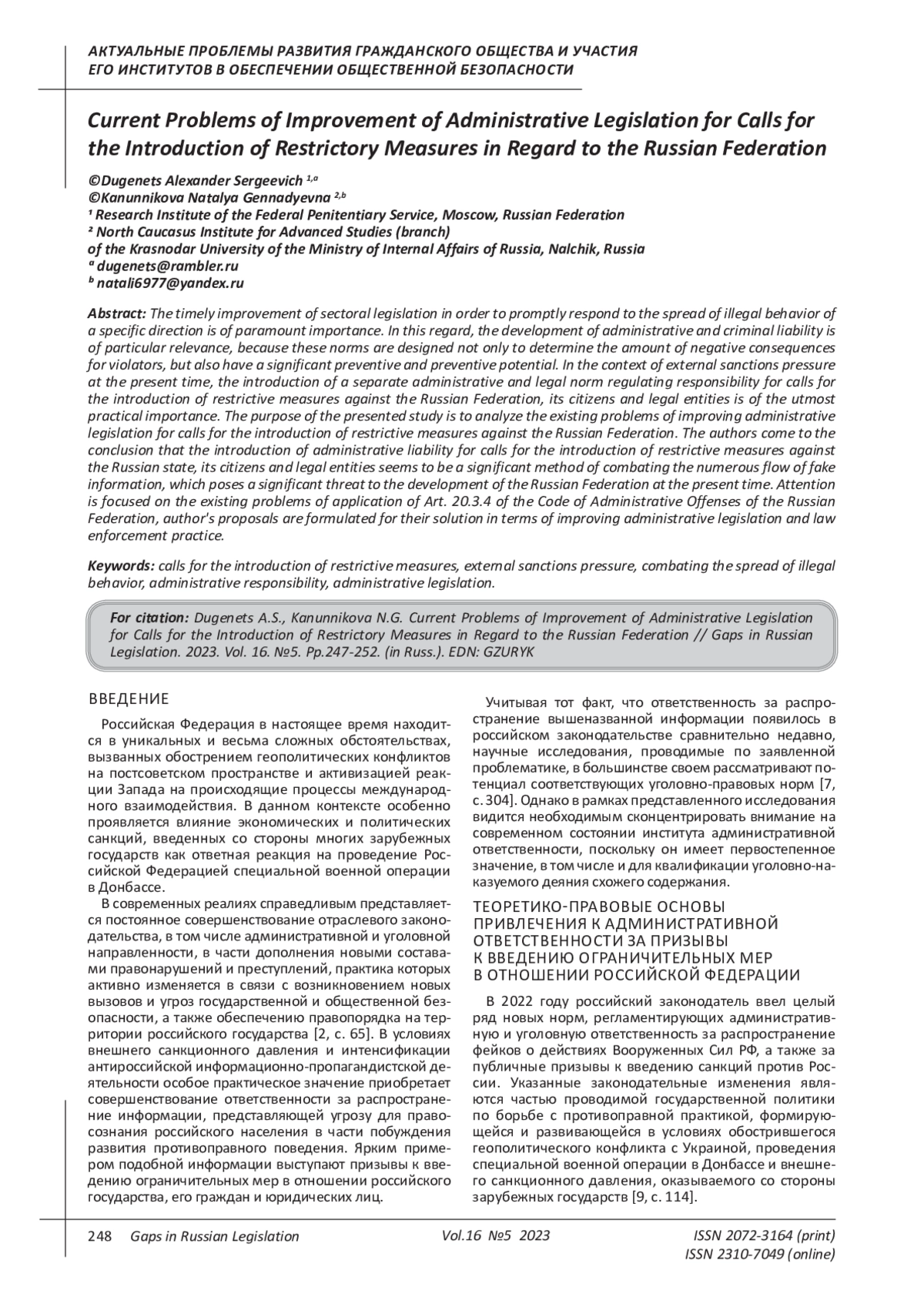В современных реалиях, связанных с обострением геополитических конфликтов и активизацией антироссийской пропагандистской деятельности важнейшее значение приобретает своевременное совершенствование отраслевого законодательства в целях оперативного реагирования на распространение противоправного поведения конкретной направленности. В данном контексте особую актуальность приобретает опережающее развитие института административной и уголовной ответственности, поскольку указанные нормы призваны не только определять объем негативных последствий для лиц, совершающих противоправные деяния, но и имеют существенный профилактико-предупредительный потенциал. В условиях внешнего санкционного давления, осуществляемого со стороны многих зарубежных государств в настоящее время, важнейшее практическое значение имеет введение отдельной административно-правовой нормы, регламентирующей ответственность за призывы к введению ограничительных мер в отношении Российской Федерации, ее граждан и юридических лиц. Целью представленного исследования выступает анализ существующих проблем совершенствования административного законодательства за призывы к введению ограничительных мер в отношении Российской Федерации. Авторы приходят к выводу о том, что введение административной ответственности за призывы к введению ограничительных мер против российского государства, его граждан и юридических лиц представляется значимым методом борьбы с многочисленным потоком фейковой информации, которая представляет существенную угрозу для развития Российской Федерации в настоящее время. Акцентируется внимание на существующих проблемах применения ст. 20.3.4 КоАП РФ, формулируются авторские предложения по их решению в части совершенствования административного законодательства и правоприменительной практики.