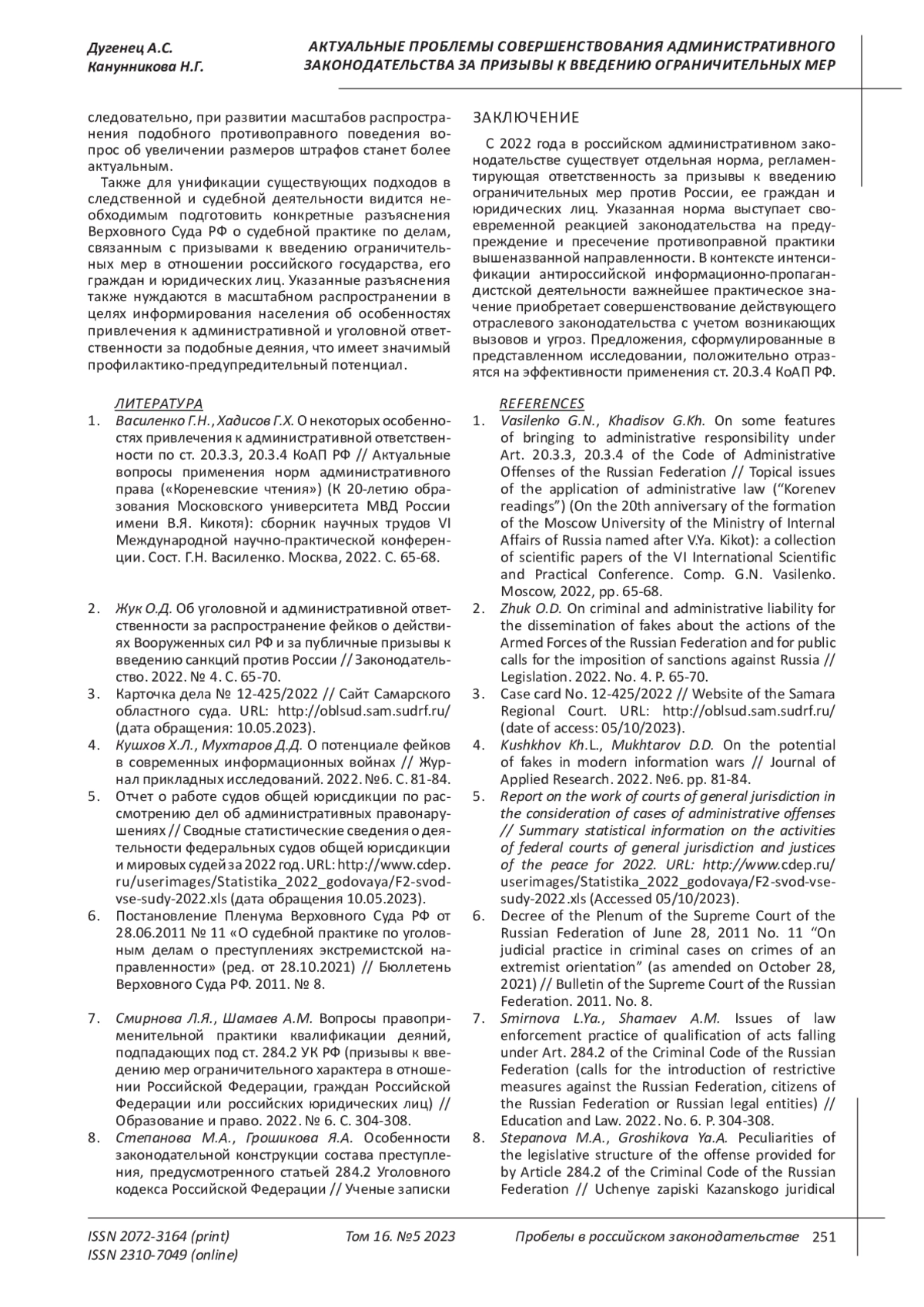 7. Смирнова Л.Я., Шамаев А.М. Вопросы правоприменительной практики квалификации деяний, подпадающих под ст. 284.2 УК РФ (призывы к введению мер ограничительного характера в отношении Российской Федерации, граждан Российской Федерации или российских юридических лиц) // Образование и право. 2022. № 6. С. 304-308. EDN: CBZBOX