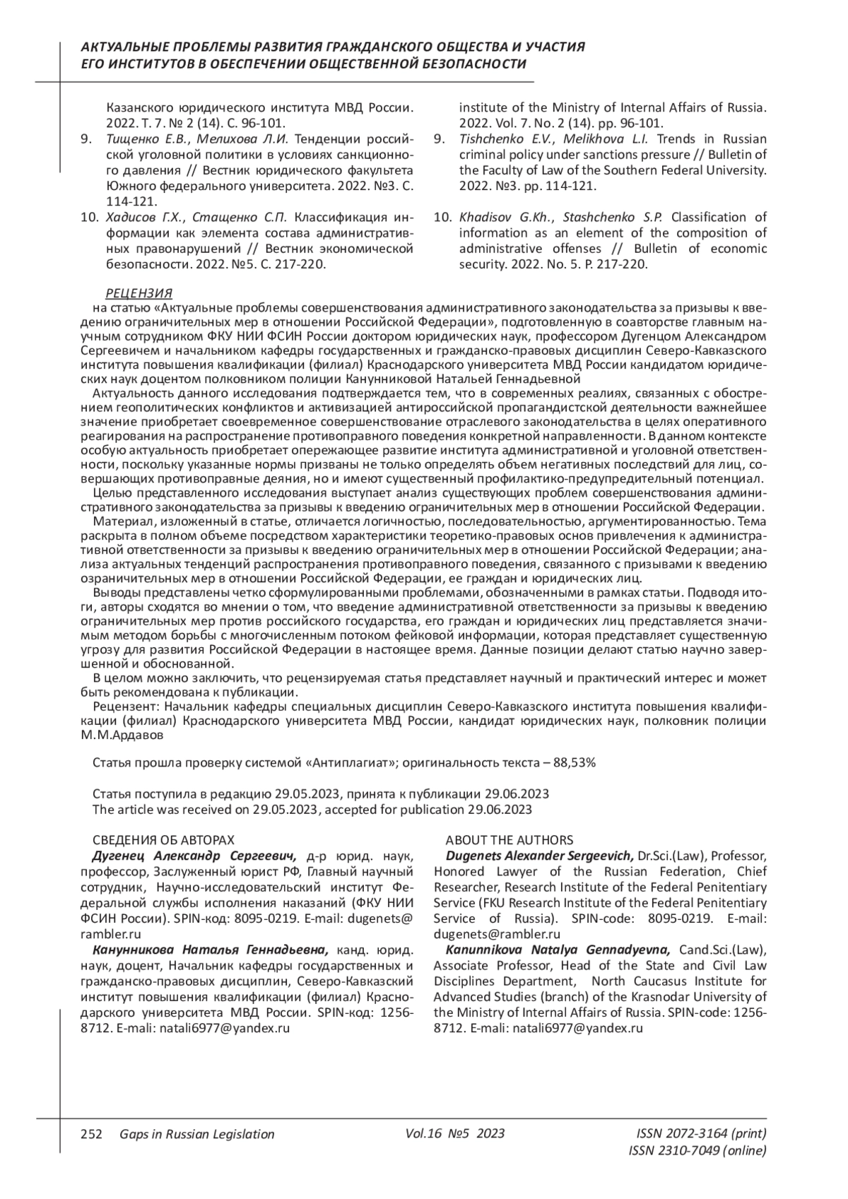 9. Тищенко Е.В., Мелихова Л.И. Тенденции российской уголовной политики в условиях санкционного давления // Вестник юридического факультета Южного федерального университета. 2022. №3. С. 114-121. EDN: BSSVWP