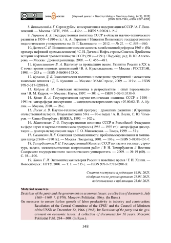 14. Кулик В. А. Государственная научно-техническая политика СССР в 1980-1991 гг. : автореферат диссертации … кандидата исторических наук : 07.00.02 / В. А. Кулик. - Москва, 2010. - 26 с.