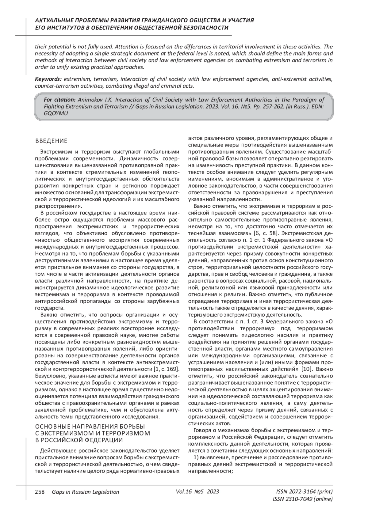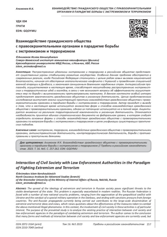 Распространение идеологии экстремизма и терроризма в российском обществе представляет существенные угрозы стабильному развитию государства. Особенно данная проблема обостряется в современных реалиях, когда Российская Федерация столкнулась с целым рядом новых вызовов национальной безопасности, начиная от обострения геополитического конфликта с Украиной и проведением специальной военной операции в Донбассе, и заканчивая санкционным давлением зарубежных стран. Антироссийская пропаганда, осуществляемая в настоящее время, способствует масштабному распространению экстремистских и террористических идей и взглядов, в связи с чем возникают вопросы об эффективности осуществляемых мер по борьбе с вышеназванными противоправными явлениями. В данном контексте особый интерес представляет вовлеченность гражданского общества в указанную деятельность. Целью представленного исследования выступает анализ существующей практики взаимодействия гражданского общества с правоохранительными органами в парадигме борьбы с экстремизмом и терроризмом. Автор приходит к выводу о том, что в настоящее время используется множество форм и способов взаимодействия гражданского общества с правоохранительными органами, однако их потенциал используется не в полной мере. Акцентируется внимание на различиях территориальной вовлеченности в указанную деятельность. Отмечается необходимость принятия единого стратегического документа на федеральном уровне, в котором следует определить основные формы и способы взаимодействия гражданского общества с правоохранительными органами по вопросам борьбы с экстремизмом и терроризмом в целях унификации существующих практических подходов.