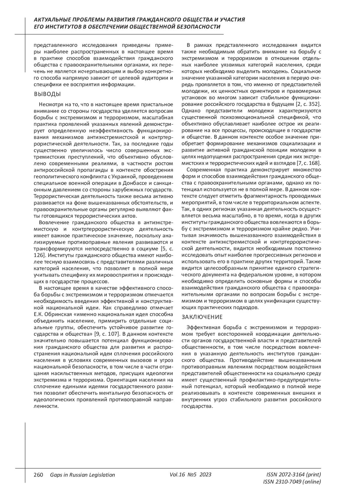 4. Григорьева О.Н., Гаврилова Н.А., Девяткина А.П. Профилактика экстремизма и терроризма как процесс формирования гражданской позиции студентов // Самарский научный вестник. 2022. №1. C. 293-296. EDN: HIIFBQ