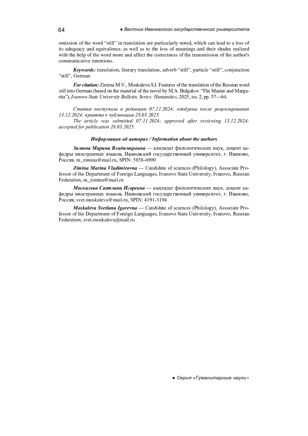 В данной статье на материале романа М. А. Булгакова «Мастер и Маргарита» и его перевода на немецкий язык, выполненного Р. Шредером, рассматриваются способы перевода русского слова «ещё» на немецкий язык. В ходе исследования выявляется частеречная принадлежность данной лексической единицы. Все случаи употребления в романе лексемы ещё делятся на три группы: наречие, частица и союз ещё, которые могут выступать в разных значениях. Рассматриваются случаи, когда исходная часть речи при переводе заменяется на другую. Одним из результатов исследования является определение наиболее частотных способов перевода слова ещё на немецкий язык, а именно использование при переводе логических частиц noch и schon. Наряду с дословным переводом описываются также переводческие трансформации, связанные с заменой данной лексемы на другие лексические единицы. Особо отмечаются случаи опущения слова ещё при переводе, что может вести к потере его адекватности и эквивалентности, а также к утрате реализуемых с помощью слова ещё значений и их оттенков, и влиять на правильность передачи коммуникативных намерений автора.