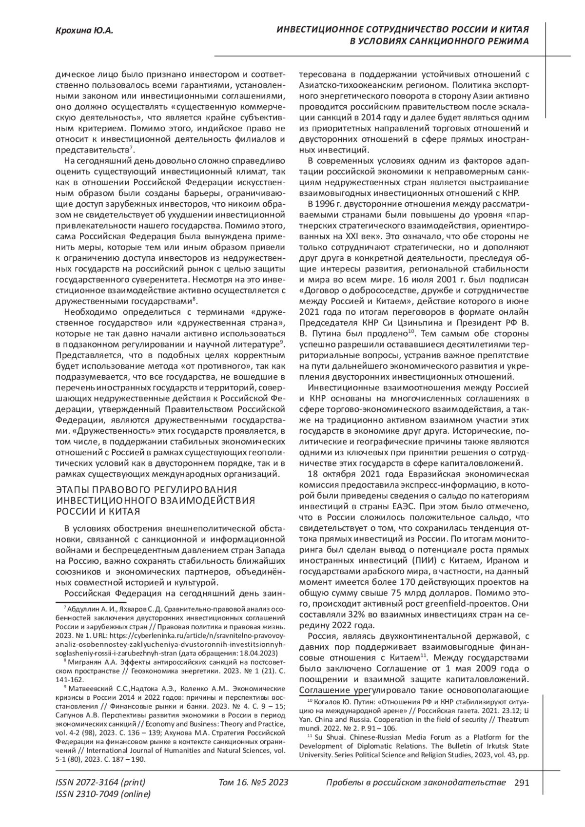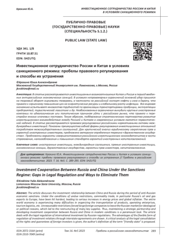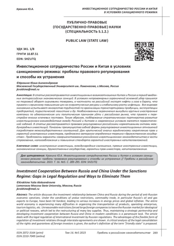 В статье рассматриваются инвестиционные взаимоотношения Китая и Россия в период введенных антироссийских экономических санкций. В условиях неправомерных ограничений основной удар пришелся на торговый оборот сырьевыми товарами, в частности на российский экспорт нефти и газа в Европу, что привело к серьезному повышению цен на энергетические ресурсы и глобальному росту инфляции. Вся мировая экономика испытывает множество трудностей по организации транспортировки продукции, эксплуатации предприятий, туристической логистике и др. Необоснованные ограничения вынудили крупные иностранные компании по идеологическим или политическим причинам уйти с российского рынка, что привело к перестройке многих ключевых поставок. Таким образом, поддержание стратегического партнерства развитие инвестиционного взаимодействия между Россией и Китаем в современных условиях является первостепенной задачей. В статье рассматривается правовое регулирование российскими нормативными актами международных инвестиций. Показаны преимущества гибкой формы регулирования инвестиционных отношений посредством межгосударственных соглашений. Дан критический анализ юридическому закреплению прав и гарантий иностранных инвесторов, предложено авторское определение термина «дружественное государство». Предложены варианты совершенствования российского инвестиционного законодательства в части страхования, налогообложения и повышения стандарта гарантий иностранных капиталовложений.