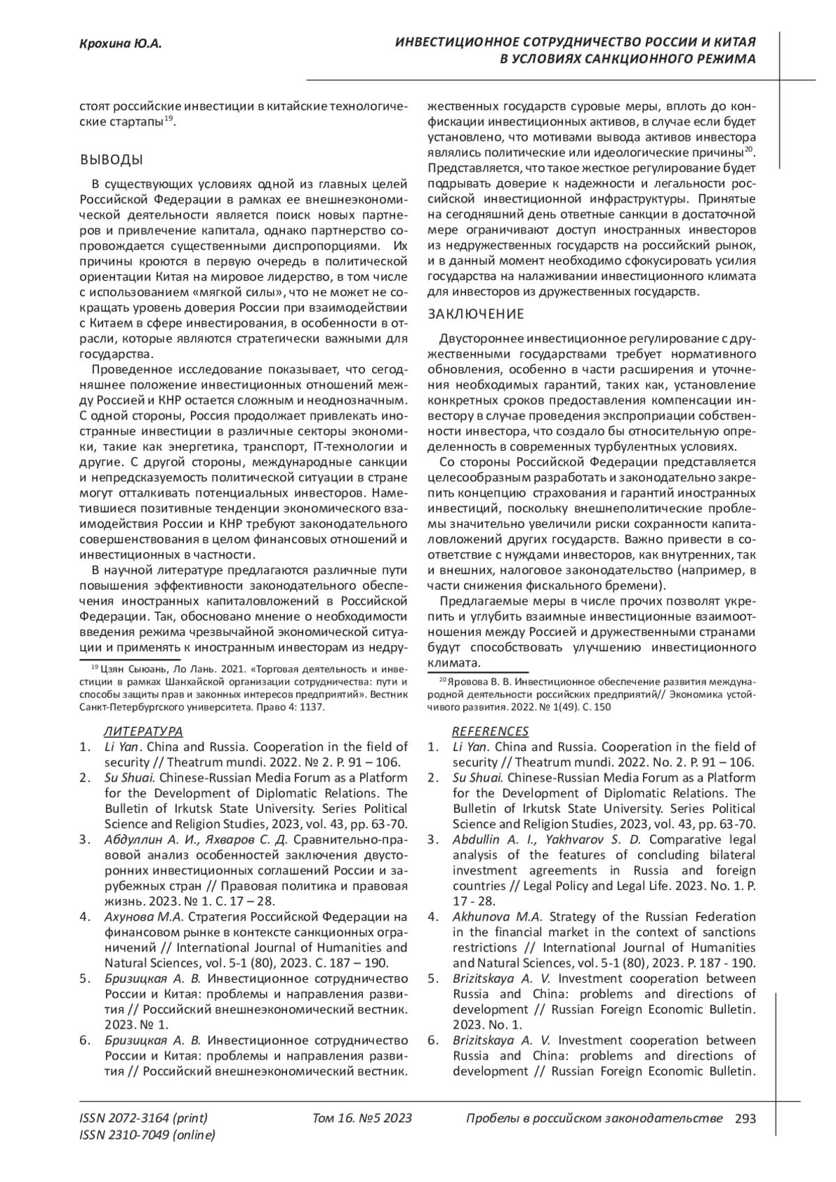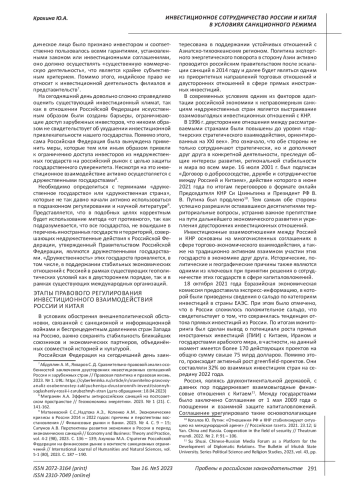 6. Бризицкая А. В. Инвестиционное сотрудничество России и Китая: проблемы и направления развития // Российский внешнеэкономический вестник. 2023. № 1. С. 43 -57. EDN: HJEXXP